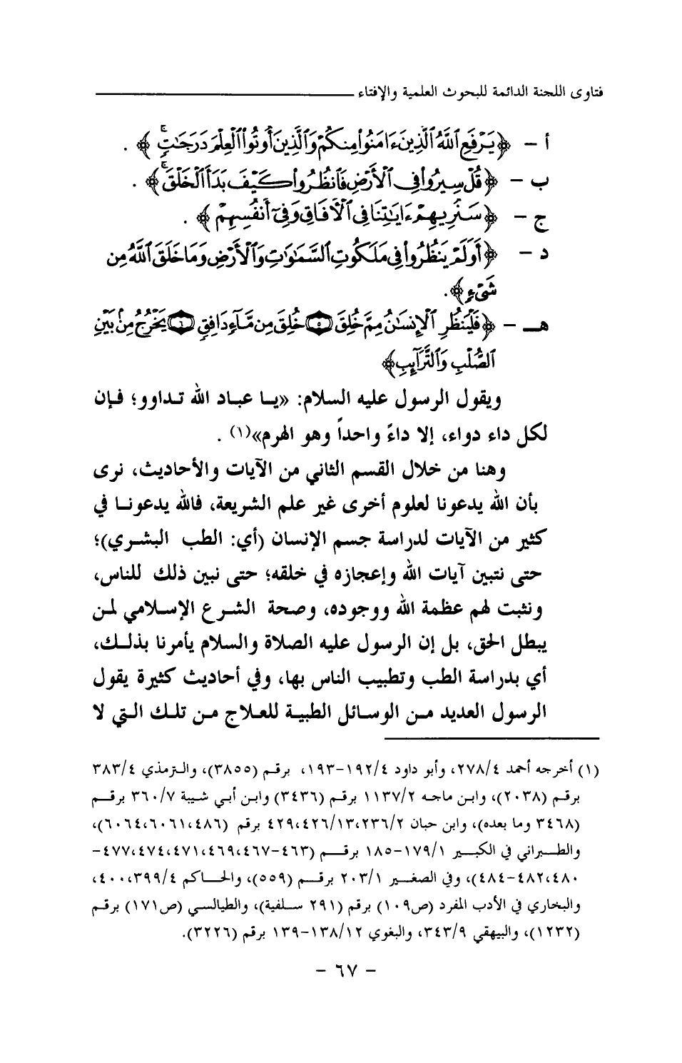 وهنا من خلال القسم الثاني من الآيات والأحاديث، نرى بأن الله يدعونا لعلوم أخرى غير علم الشريعة، فالله يدعونا في كثير من الآيات لدراسة جسم الإنسان (أي: الطب البشري) ؛ حتى نتبين آيات الله وإعجازه في خلقه؛ حتى نبين ذلك للناس، ونثبت لهم عظمة الله ووجوده، وصحة الشرع الإسلامي لمن يبطل الحق، بل إن الرسول عليه الصلاة والسلام يأمرنا بذلك، أي بدراسة الطب وتطبيب الناس بها، وفي أحاديث كثيرة يقول الرسول العديد من الوسائل الطبية للعلاج من تلك التي لا