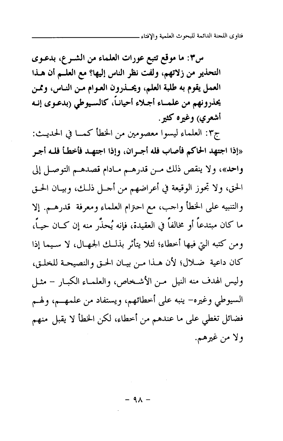 ج3: العلماء ليسوا معصومين من الخطأ كما في الحديث: «إذا اجتهد الحاكم فأصاب فله أجران، وإذا اجتهد فأخطأ فله أجر واحد (¬1) » ، ولا ينقص ذلك من قدرهم ما دام قصدهم التوصل إلى الحق، ولا تجوز الوقيعة في أعراضهم من أجل ذلك، وبيان الحق والتنبيه على الخطأ واجب، مع احترام العلماء ومعرفة قدرهم. إلا ما كان مبتدعا أو مخالفا في العقيدة، فإنه يحذر منه إن كان حيا، ومن كتبه التي قيها أخطاء؛ لئلا يتأثر بذلك الجهال، لا سيما إذا كان داعية ضلال؛ لأن هذا من بيان الحق والنصيحة للخلق، وليس الهدف منه النيل من الأشخاص، والعلماء الكبار- مثل السيوطي وغيره- ينبه على أخطائهم، ويستفاد من علمهم، ولهم فضائل تغطي على ما عندهم من أخطاء، لكن الخطأ لا يقبل منهم ولا من غيرهم.
