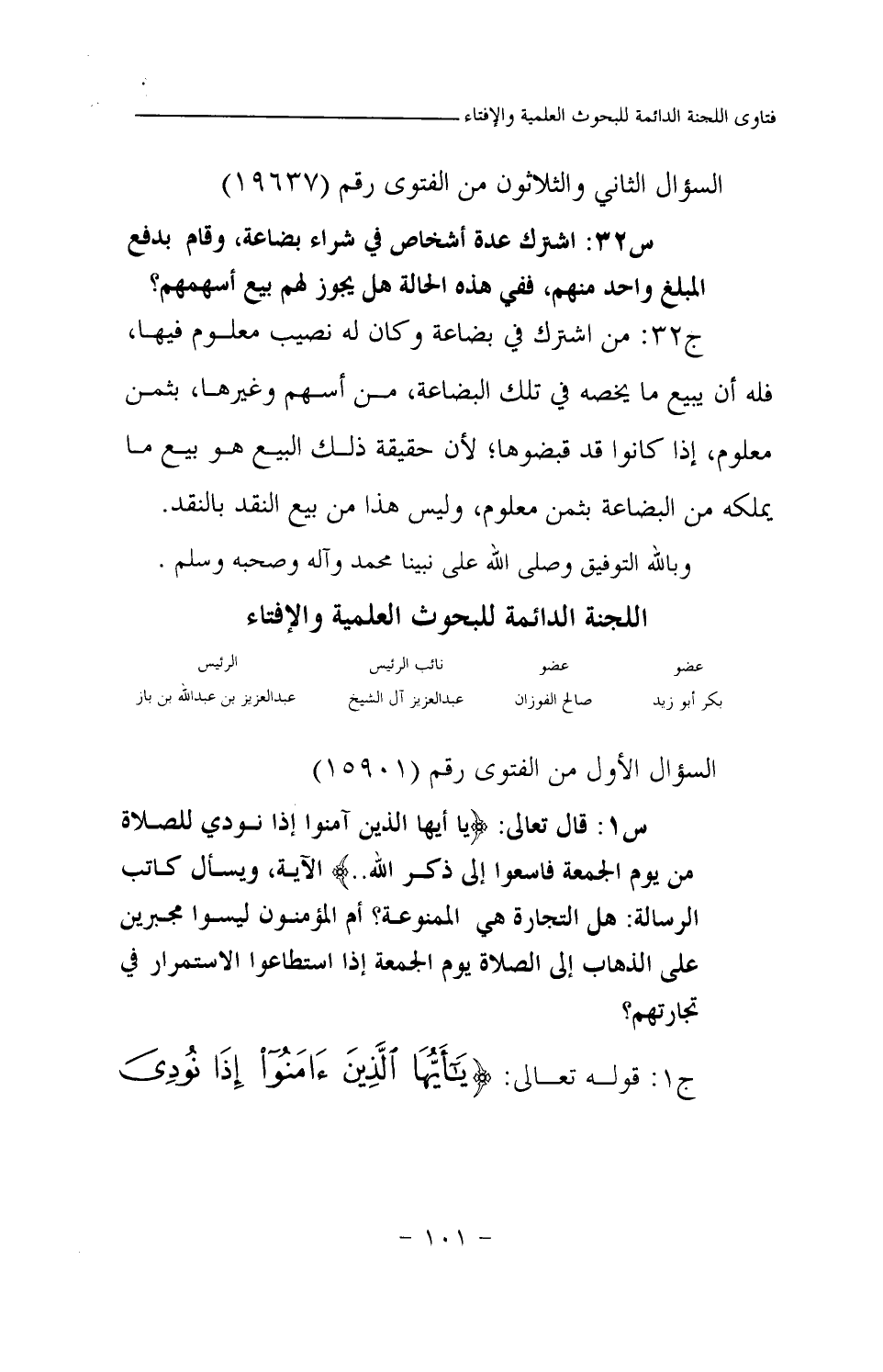 س1: قال تعالى: {يَا أَيُّهَا الَّذِينَ آمَنُوا إِذَا نُودِيَ لِلصَّلَاةِ مِنْ يَوْمِ الْجُمُعَةِ فَاسْعَوْا إِلَى ذِكْرِ اللَّهِ} (¬1) الآية، ويسأل كاتب الرسالة: هل التجارة هي الممنوعة؟ أم المؤمنون ليسوا مجبرين على الذهاب إلى الصلاة يوم الجمعة إذا استطاعوا الاستمرار في تجارتهم؟