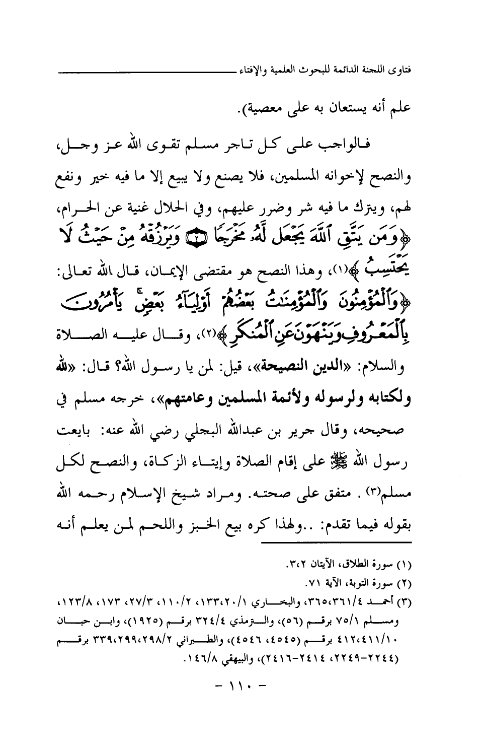 فالواجب على كل تاجر مسلم تقوى الله عز وجل، والنصح لإخوانه المسلمين، فلا يصنع ولا يبيع إلا ما فيه خير ونفع لهم، ويترك ما فيه شر وضرر عليهم، وفي الحلال غنية عن الحرام، {وَمَنْ يَتَّقِ اللَّهَ يَجْعَلْ لَهُ مَخْرَجًا} (¬1) {وَيَرْزُقْهُ مِنْ حَيْثُ لَا يَحْتَسِبُ} (¬2) وهذا النصح هو مقتضى الإيمان، قال الله تعالى: {وَالْمُؤْمِنُونَ وَالْمُؤْمِنَاتُ بَعْضُهُمْ أَوْلِيَاءُ بَعْضٍ يَأْمُرُونَ بِالْمَعْرُوفِ وَيَنْهَوْنَ عَنِ الْمُنْكَرِ} (¬3) وقال عليه الصلاة والسلام: «الدين النصيحة، قيل: لمن يا رسول الله؟ قال: "لله ولكتابه ولرسوله ولأئمة المسلمين وعامتهم (¬4) » ، خرجه مسلم في صحيحه وقال جرير بن عبد الله البجلي رضي الله عنه: «بايعت رسول الله صلى الله عليه وسلم على إقام الصلاة وإيتاء الزكاة، والنصح لكل مسلم (¬5) » . متفق على صحته ومراد شيخ الإسلام رحمه الله بقوله فيما تقدم:.. ولهذا كره بيع الخبز واللحم لمن يعلم أنه