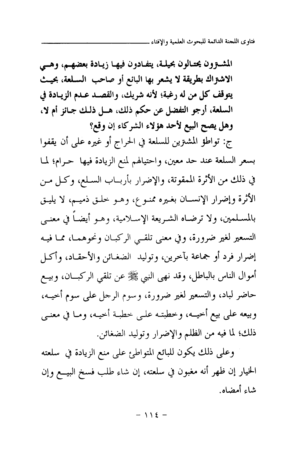 ج: تواطؤ المشترين للسلعة في الحراج أو غيره على أن يقفوا بسعر السلعة عند حد معين، واحتيالهم لمنع الزيادة فيها حرام؛ لما في ذلك من الأثرة الممقوتة، والإضرار بأرباب السلع، وكل من الأثرة وإضرار الإنسان بغيره ممنوع، وهو خلق ذميم، لا يليق بالمسلمين، ولا ترضاه الشريعة الإسلامية، وهو أيضا في معنى التسعير لغير ضرورة، وفي معنى تلقي الركبان ونحوهما، مما فيه إضرار فرد أو جماعة بآخرين، وتوليد الضغائن والأحقاد، وأكل أموال الناس بالباطل، وقد نهى النبي صلى الله عليه وسلم عن تلقي الركبان، وبيع حاضر لباد، والتسعير لغير ضرورة، وسوم الرجل على سوم أخيه، وبيعه على بيع أخيه، وخطبته على خطبة أخيه، وما في معنى ذلك؛ لما فيه من الظلم والإضرار وتوليد الضغائن.
