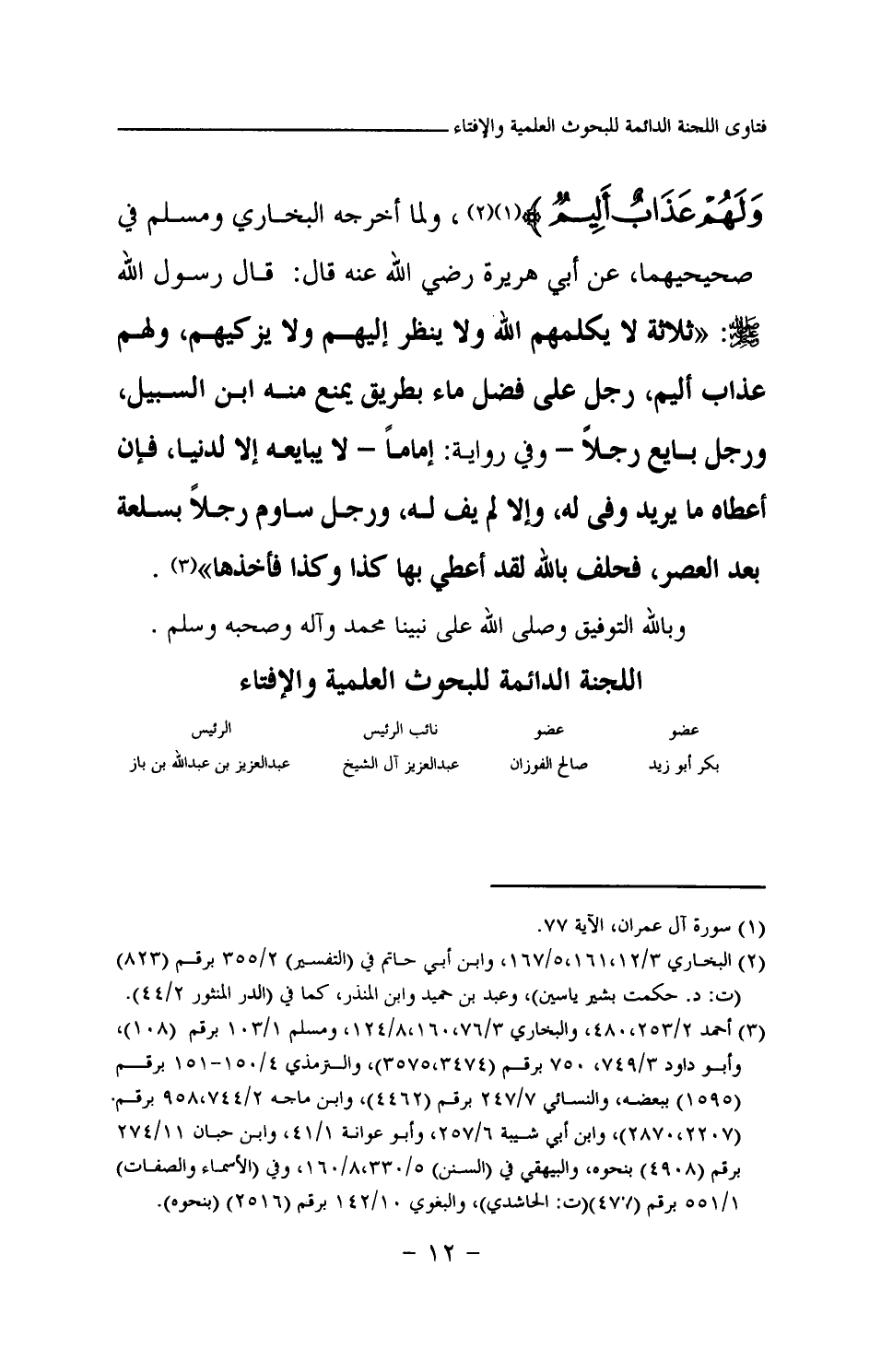 ولما أخرجه البخاري ومسلم في صحيحيهما، عن أبي هريرة رضي الله عنه قال: قال رسول الله صلى الله عليه وسلم: «ثلاثة لا يكلمهم الله ولا ينظر إليهم ولا يزكيهم، ولهم عذاب أليم، رجل على فضل ماء بطريق يمنع منه ابن السبيل، ورجل بايع رجلا - وفي رواية: إماما - لا يبايعه إلا لدنيا، فإن أعطاه ما يريد وفى له، وإلا لم يف له، ورجل ساوم رجلا بسلعة بعد العصر، فحلف بالله لقد أعطي بها كذا وكذا فأخذها (¬1) » .
