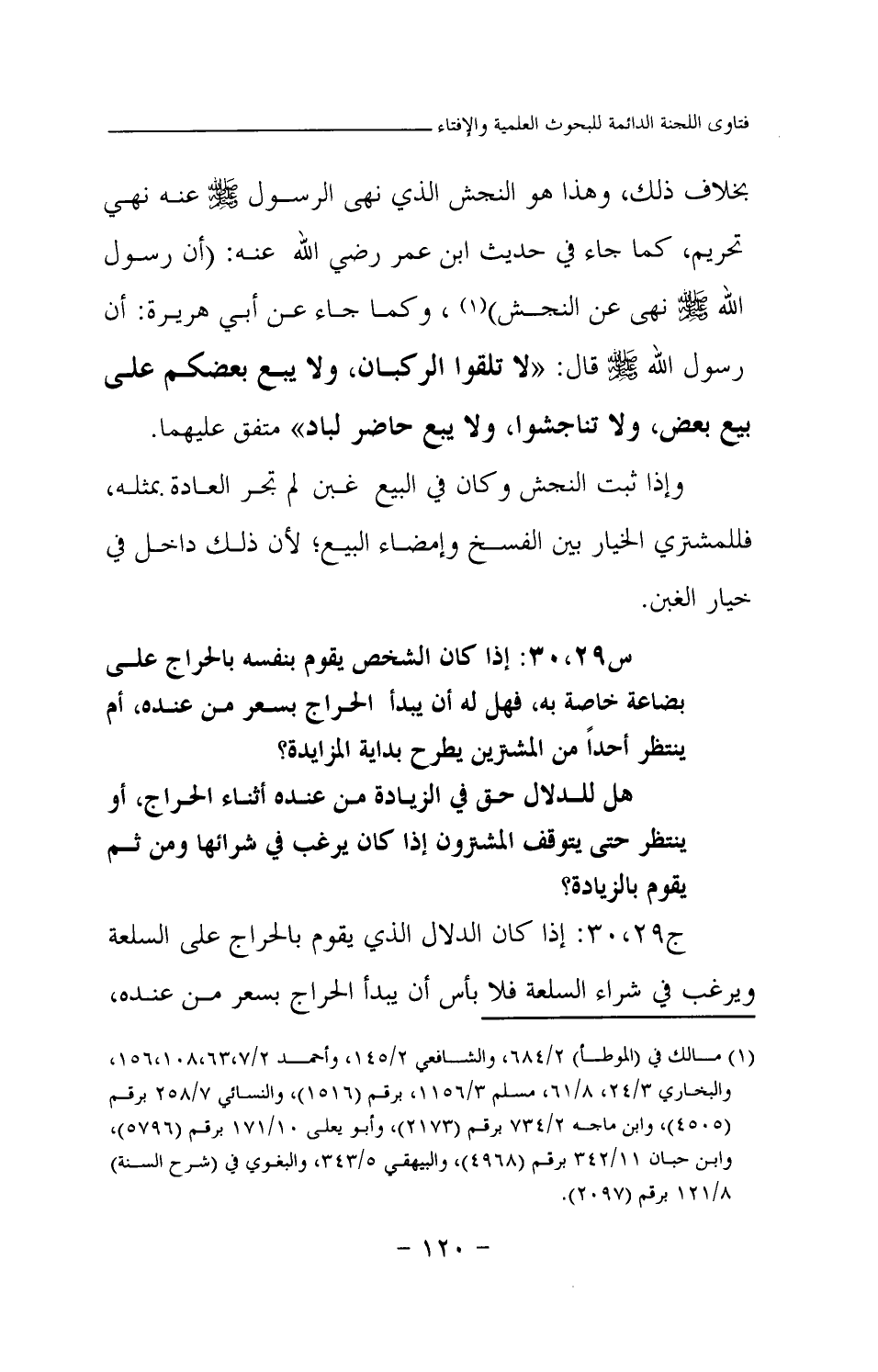 بخلاف ذلك، وهذا هو النجش الذي نهى الرسول صلى الله عليه وسلم عنه نهي تحريم، كما جاء في حديث ابن عمر رضي الله عنه: «أن رسول الله صلى الله عليه وسلم نهى عن النجش (¬1) » وكما جاء عن أبي هريرة: أن رسول الله صلى الله عليه وسلم قال: «لا تلقوا الركبان، ولا يبع بعضكم على بيع بعض، ولا تناجشوا، ولا يبع حاضر لباد (¬2) » متفق عليهما.