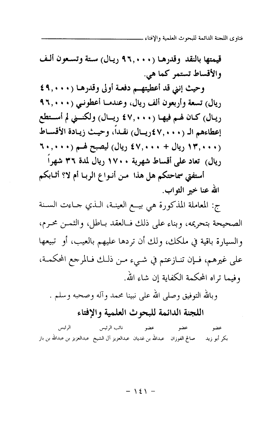 ج: المعاملة المذكورة هي بيع العينة، الذي جاءت السنة الصحيحة بتحريمه، وبناء على ذلك فالعقد باطل، والثمن محرم، والسيارة باقية في ملكك، ولك أن تردها عليهم بالعيب، أو تبيعها على غيرهم، فإن تنازعتم في شيء من ذلك فالمرجع المحكمة، وفيما تراه المحكمة الكفاية إن شاء الله.