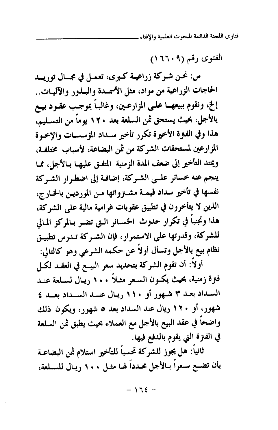 س: نحن شركة زراعية كبرى، تعمل في مجال توريد الحاجات الزراعية من مواد، مثل الأسمدة والبذور والآليات.. إلخ، ونقوم ببيعها على المزارعين، وغالبا بموجب عقود بيع بالأجل، بحيث يستحق ثمن السلعة بعد 120 يوما من التسليم، هذا وفي الفترة الأخيرة تكرر تأخير سداد المؤسسات والإخوة المزارعين لمستحقات الشركة من ثمن البضاعة، لأسباب مختلفة، ويمتد التأخير إلى ضعف المدة الزمنية المتفق عليها بالأجل، مما ينجم عنه خسائر على الشركة، إضافة إلى اضطرار الشركة نفسها في تأخير سداد قيمة مشترواتها من الموردين بالخارج، الذين لا يتأخرون في تطبيق عقوبات غرامية مالية على الشركة، هذا وتجنبا في تكرار حدوث الخسائر التي تضر بالمركز المالي للشركة، وقدرتها على الاستمرار، فإن الشركة تدرس تطبيق نظام بيع بالأجل وتسأل أولا عن حكمه الشرعي وهو كالتالي: