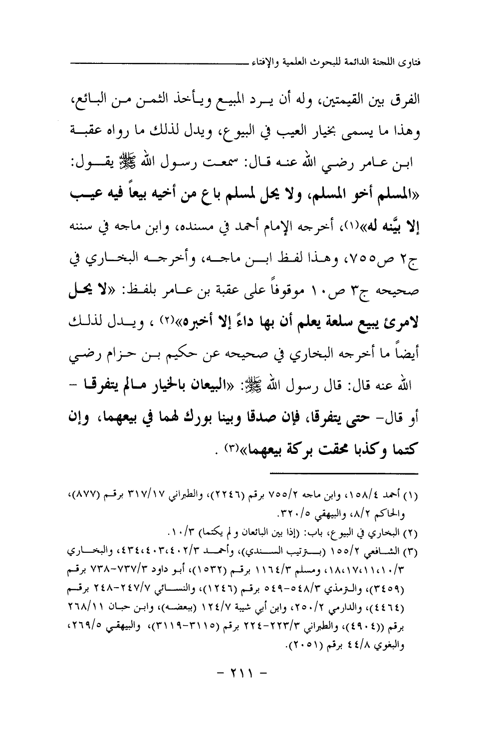 الفرق بين القيمتين، وله أن يرد المبيع ويأخذ الثمن من البائع، وهذا ما يسمى بخيار العيب في البيوع، ويدل لذلك ما رواه عقبة بن عامر رضي الله عنه قال: سمعت رسول الله صلى الله عليه وسلم يقول: «المسلم أخو المسلم، ولا يحل لمسلم باع من أخيه بيعا فيه عيب إلا بينه له (¬1) » أخرجه الإمام أحمد في مسنده، وابن ماجه في سننه ج2 ص755، وهذا لفظ ابن ماجه، وأخرجه البخاري في صحيحه ج3 ص10 موقوفا على عقبة بن عامر بلفظ: «لا يحل لامرئ يبيع سلعة يعلم أن بها داء إلا أخبره (¬2) » ويدل لذلك أيضا ما أخرجه البخاري في صحيحه عن حكيم بن حزام رضي الله عنه قال: قال رسول الله صلى الله عليه وسلم: «البيعان بالخيار ما لم يتفرقا -أو قال- حتى يتفرقا، فإن صدقا وبينا بورك لهما في بيعهما، وإن كتما وكذبا محقت بركة بيعهما (¬3) » .