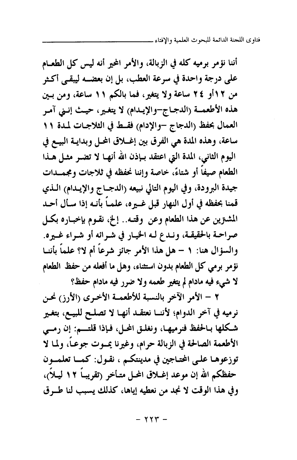 أننا نؤمر برميه كله في الزبالة، والأمر المحير أنه ليس كل الطعام على درجة واحدة في سرعة العطب، بل إن بعضه ليبقى أكثر من 12 أو 24 ساعة ولا يتغير، فما بالكم 11 ساعة، ومن بين هذه الأطعمة (الدجاج-والإيدام) لا يتغير، حيث إنني آمر العمال بحفظ (الدجاج-والإدام) فقط في الثلاجات لمدة 11 ساعة، وهذه المدة هي الفرق بين إغلاق المحل وبداية البيع في اليوم الثاني، المدة التي اعتقد بإذن الله أنها لا تضر مثل هذا الطعام صيفا أو شتاء، خاصة وإننا نحفظه في ثلاجات ومجمدات جيدة البرودة، وفي اليوم التالي نبيعه (الدجاج والإيدام) الذي قمنا بحفظه في أول النهار قبل غيره، علما بأنه إذا سأل أحد المشترين عن هذا الطعام وعن وقته.. إلخ، نقوم بإخباره بكل صراحة بالحقيقة، وندع له الخيار في شرائه أو شراء غيره. والسؤال هنا: