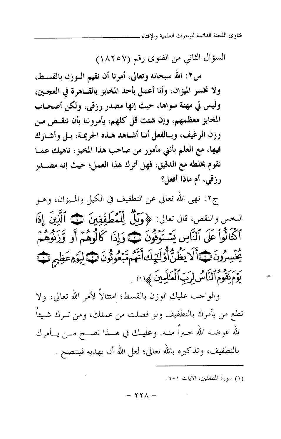 ج2: نهى الله تعالى عن التطفيف في الكيل والميزان، وهو البخس والنقص، قال تعالى: {وَيْلٌ لِلْمُطَفِّفِينَ} (¬1) {الَّذِينَ إِذَا اكْتَالُوا عَلَى النَّاسِ يَسْتَوْفُونَ} (¬2) {وَإِذَا كَالُوهُمْ أَوْ وَزَنُوهُمْ يُخْسِرُونَ} (¬3) {أَلَا يَظُنُّ أُولَئِكَ أَنَّهُمْ مَبْعُوثُونَ} (¬4) {لِيَوْمٍ عَظِيمٍ} (¬5) {يَوْمَ يَقُومُ النَّاسُ لِرَبِّ الْعَالَمِينَ} (¬6)