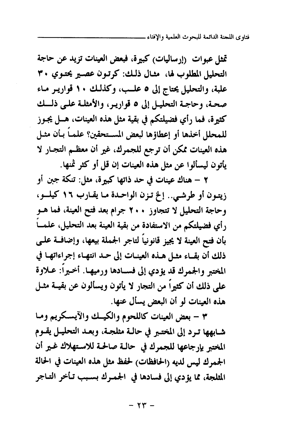 2 - هناك عينات في حد ذاتها كبيرة، مثل: تنكة جبن أو زيتون أو طرشي.. إلخ تزن الواحدة ما يقارب 16 كيلو، وحاجة التحليل لا تتجاوز 200 جرام بعد فتح العينة، فما هو رأي فضيلتكم من الاستفادة من بقية العينة بعد التحليل، علما بأن فتح العينة لا يجيز قانونيا لتاجر الجملة بيعها، وإضافة على ذلك أن بقاء مثل هذه العينات إلى حد انتهاء إجراءاتها في المختبر والجمرك قد يؤدي إلى فسادها ورميها. أخيرا: علاوة على ذلك أن كثيرا من التجار لا يأتون ويسألون عن بقية مثل هذه العينات لو أن البعض يسأل عنها.