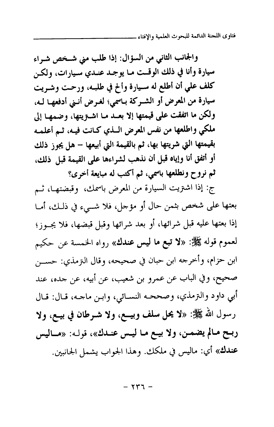 ج: إذا اشتريت السيارة من المعرض باسمك، وقبضتها، ثم بعتها على شخص بثمن حال أو مؤجل؛ فلا شيء في ذلك، أما إذا بعتها عليه قبل شرائها، أو بعد شرائها وقبل قبضها، فلا يجوز؛ لعموم قوله صلى الله عليه وسلم: «لا تبع ما ليس عندك (¬1) » رواه الخمسة عن حكيم ابن حزام، وأخرجه ابن حبان في صحيحه، وقال الترمذي: حسن صحيح وفي الباب عن عمرو بن شعيب، عن أبيه، عن جده، عند أبي داود والترمذي، وصححه النسائي، وابن ماجه، قال: قال رسول الله صلى الله عليه وسلم: «لا يحل سلف وبيع، ولا شرطان في بيع، ولا ربح ما لم يضمن، ولا بيع ما ليس عندك (¬2) » ، قوله: (ما ليس عندك) أي: ما ليس في ملكك. وهذا الجواب يشمل الجانبين.