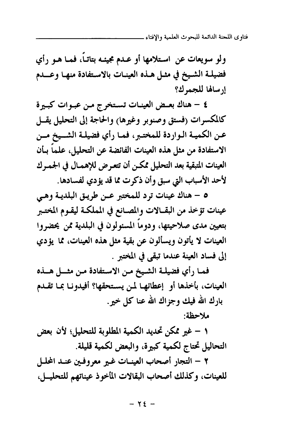 4 - هناك بعض العينات تستخرج من عبوات كبيرة كالمكسرات (فستق وصنوبر وغيرها) والحاجة إلى التحليل يقل عن الكمية الواردة للمختبر، فما رأي فضيلة الشيخ من الاستفادة من مثل هذه العينات الفائضة عن التحليل، علما بأن العينات المتبقية بعد التحليل ممكن أن تتعرض للإهمال في الجمرك لأحد الأسباب التي سبق وأن ذكرت مما قد يؤدي لفسادها.