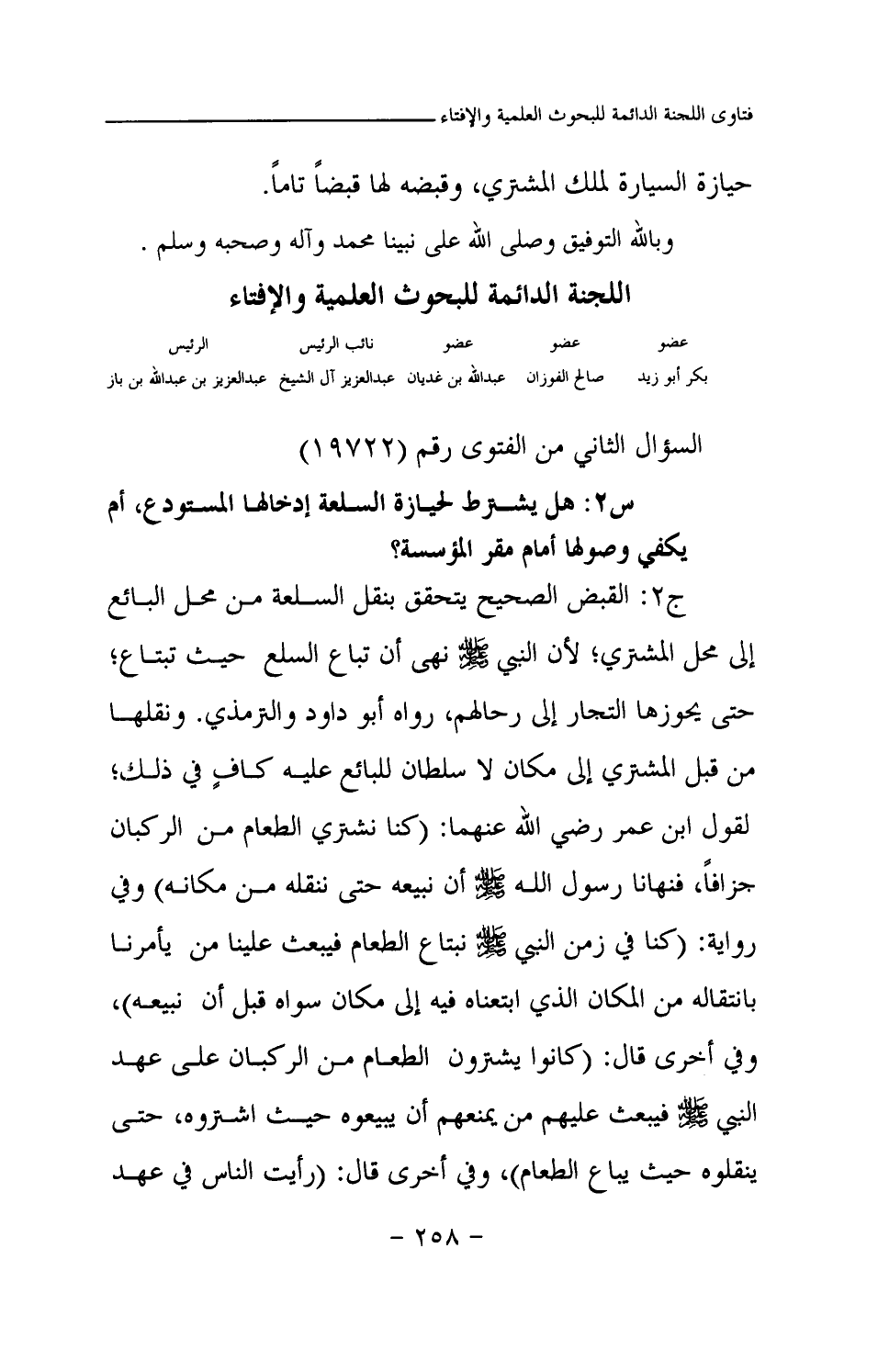 ج2: القبض الصحيح يتحقق بنقل السلعة من محل البائع إلى محل المشتري؛ لأن النبي صلى الله عليه وسلم نهى أن تباع السلع حيث تبتاع؛ حتى يحوزها التجار إلى رحالهم، رواه أبو داود والترمذي. ونقلها من قبل المشتري إلى مكان لا سلطان للبائع عليه كاف في ذلك؛ لقول ابن عمر رضي الله عنهما: «كنا نشتري الطعام من الركبان جزافا، فنهانا رسول الله صلى الله عليه وسلم أن نبيعه حتى ننقله من مكانه (¬1) » وفي رواية: «كنا في زمن النبي صلى الله عليه وسلم نبتاع الطعام فيبعث علينا من يأمرنا بانتقاله من المكان الذي ابتعناه فيه إلى مكان سواه قبل أن نبيعه (¬2) » ، وفي أخرى قال: «كانوا يشترون الطعام من الركبان على عهد النبي صلى الله عليه وسلم فيبعث عليهم من يمنعهم أن يبيعوه حيث اشتروه، حتى ينقلوه حيث يباع الطعام (¬3) » ، وفي أخرى قال: