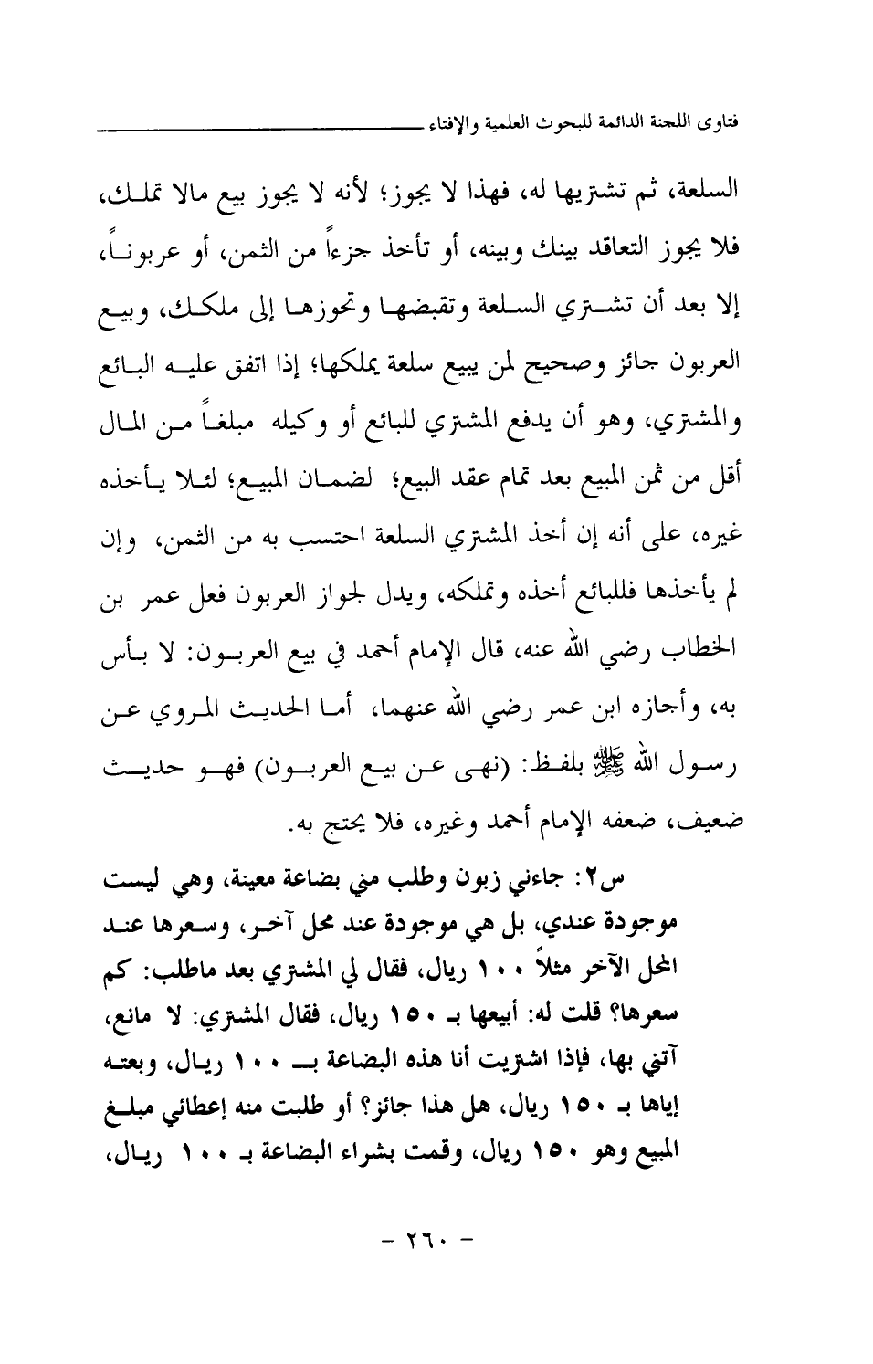 السلعة، ثم تشتريها له، فهذا لا يجوز؛ لأنه لا يجوز بيع ما لا تملك، فلا يجوز التعاقد بينك وبينه، أو تأخذ جزءا من الثمن، أو عربونا، إلا بعد أن تشتري السلعة وتقبضها وتحوزها إلى ملكك، وبيع العربون جائز وصحيح لمن يبيع سلعة يملكها؛ إذا اتفق عليه البائع والمشتري، وهو أن يدفع المشتري للبائع أو وكيله مبلغا من المال أقل من ثمن المبيع بعد تمام عقد البيع؛ لضمان المبيع؛ لئلا يأخذه غيره، على أنه إن أخذ المشتري السلعة احتسب به من الثمن، وإن لم يأخذها فللبائع أخذه وتملكه، ويدل لجواز العربون فعل عمر بن الخطاب رضي الله عنه، قال الإمام أحمد في بيع العربون: لا بأس به، وأجازه ابن عمر رضي الله عنهما، أما الحديث المروي عن رسول الله صلى الله عليه وسلم بلفظ: «نهى عن بيع العربون» فهو حديث ضعيف، ضعفه الإمام أحمد وغيره، فلا يحتج به.