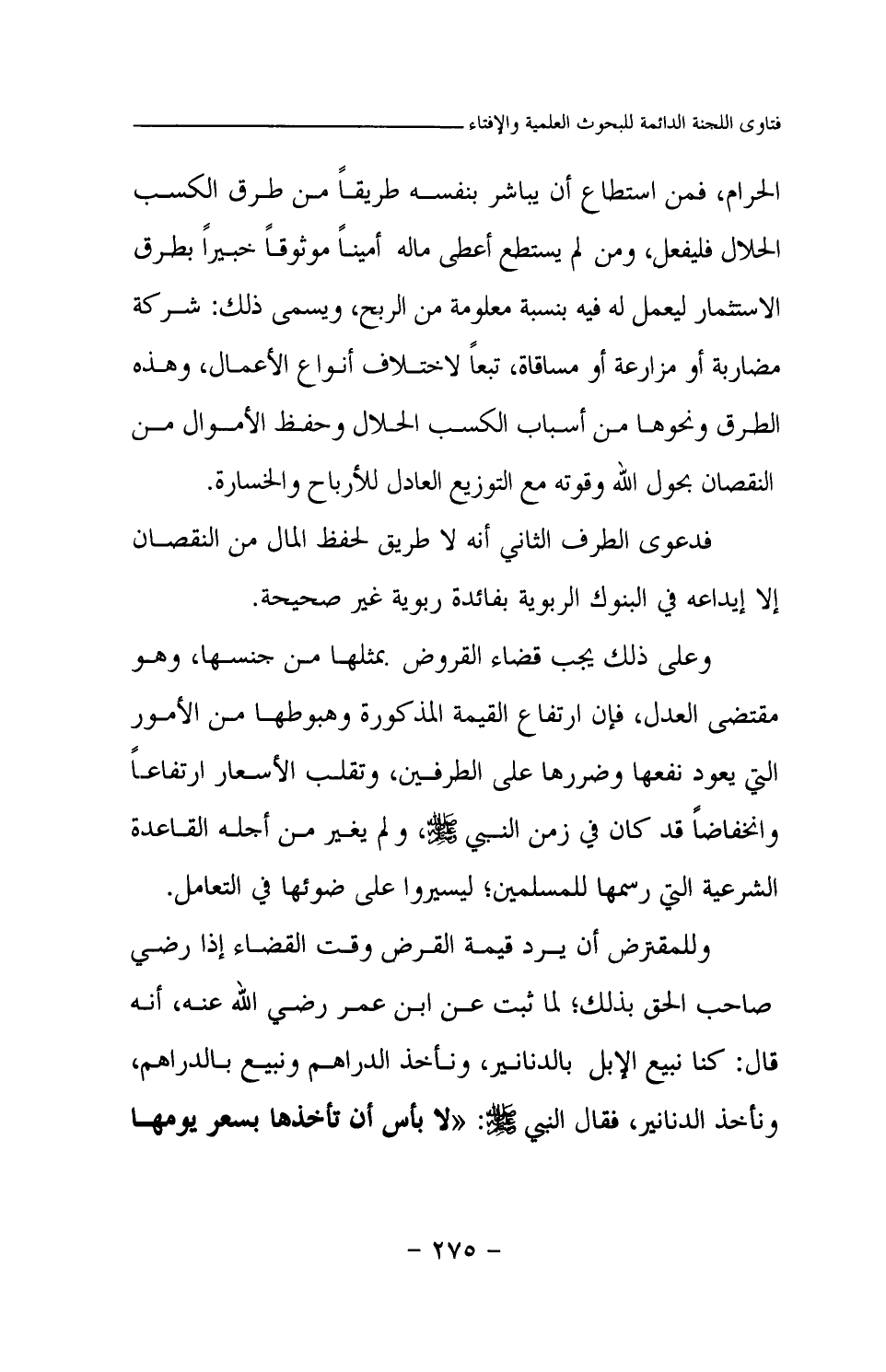 الحرام، فمن استطاع أن يباشر بنفسه طريقا من طرق الكسب الحلال فليفعل، ومن لم يستطع أعطى ماله أمينا موثوقا خبيرا بطرق الاستثمار ليعمل له فيه بنسبة معلومة من الربح، ويسمى ذلك: شركة مضاربة أو مزارعة أو مساقاة، تبعا لاختلاف أنواع الأعمال، وهذه الطرق ونحوها من أسباب الكسب الحلال وحفظ الأموال من النقصان بحول الله وقوته مع التوزيع العادل للأرباح والخسارة.