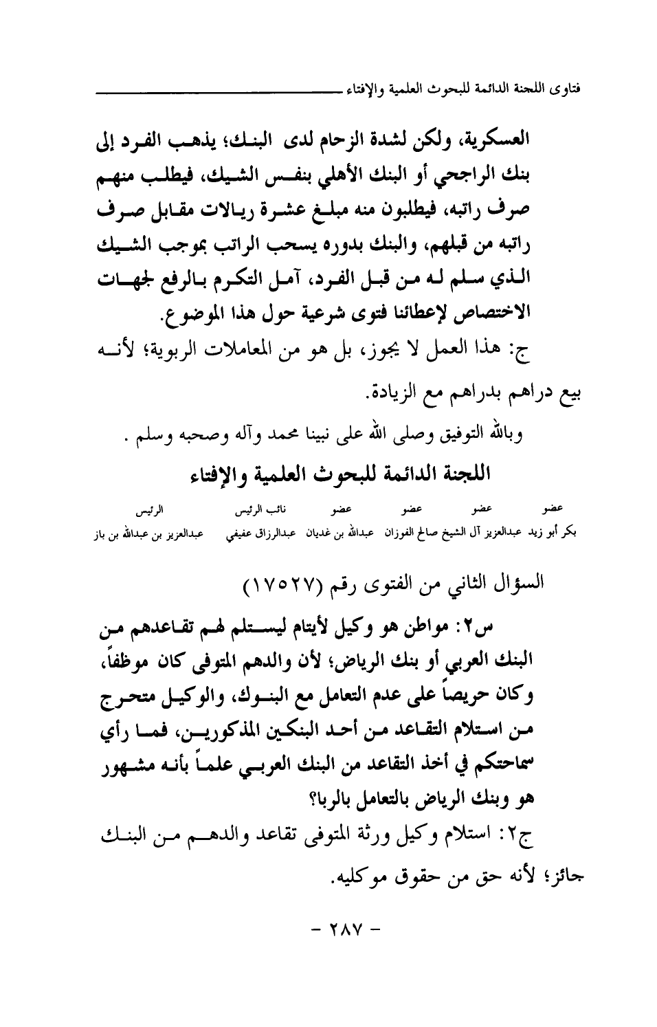 س2: مواطن هو وكيل لأيتام ليستلم لهم تقاعدهم من البنك العربي أو بنك الرياض؛ لأن والدهم المتوفى كان موظفا، وكان حريصا على عدم التعامل مع البنوك، والوكيل متحرج من استلام التقاعد من أحد البنكين المذكورين، فما رأي سماحتكم في أخذ التقاعد من البنك العربي علما بأنه مشهور هو وبنك الرياض بالتعامل بالربا؟