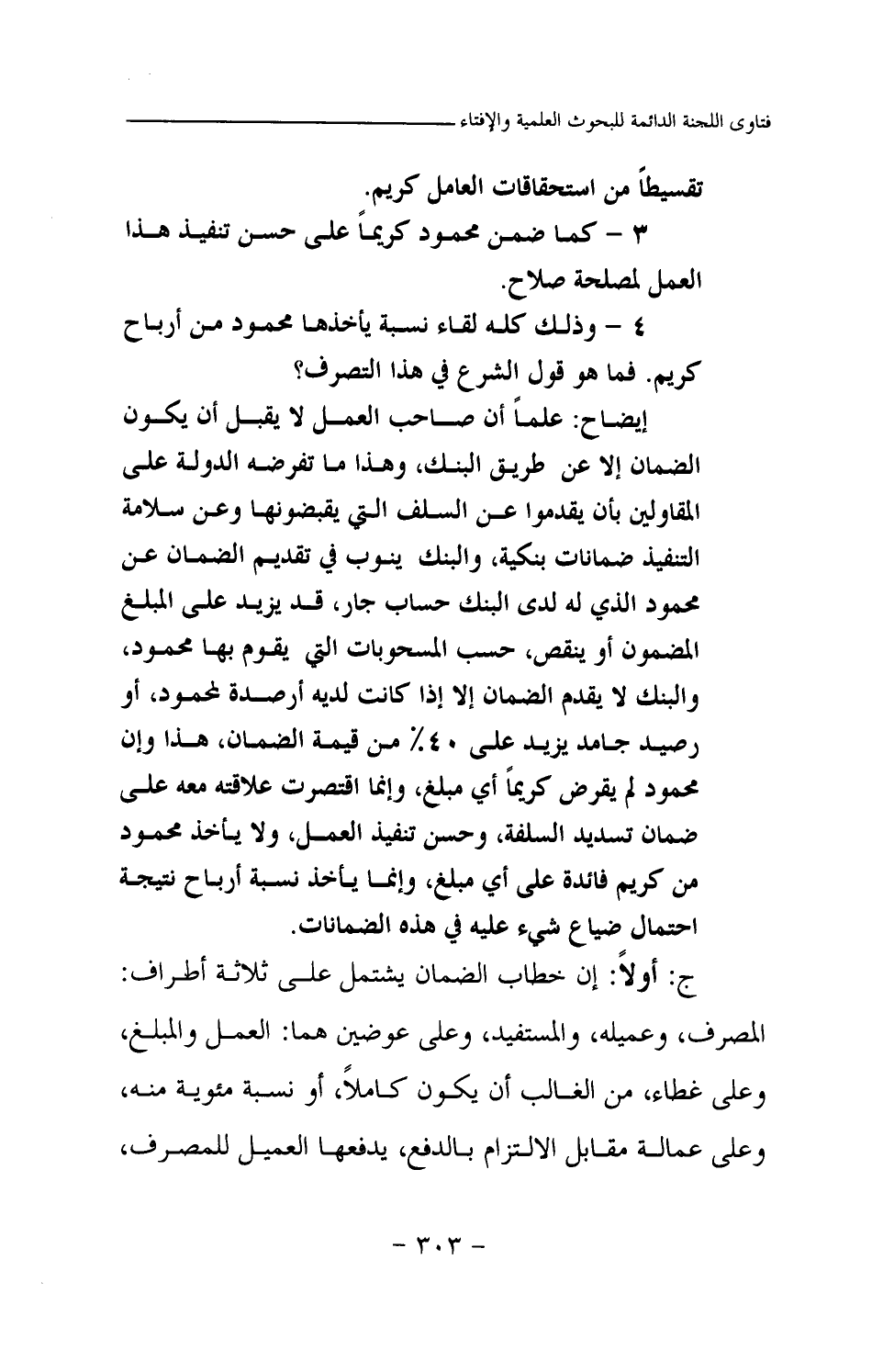 إيضاح: علما أن صاحب العمل لا يقبل أن يكون الضمان إلا عن طريق البنك، وهذا ما تفرضه الدولة على المقاولين بأن يقدموا عن السلف التي يقبضونها وعن سلامة التنفيذ ضمانات بنكية، والبنك ينوب في تقديم الضمان عن محمود الذي له لدى البنك حساب جار، قد يزيد على المبلغ المضمون أو ينقص، حسب المسحوبات التي يقوم بها محمود، والبنك لا يقدم الضمان إلا إذا كانت لديه أرصدة لمحمود، أو رصيد جامد يزيد على 40% من قيمة الضمان، هذا وإن محمود لم يقرض كريما أي مبلغ، وإنما اقتصرت علاقته معه على ضمان تسديد السلفة، وحسن تنفيذ العمل، ولا يأخذ محمود من كريم فائدة على أي مبلغ، وإنما يأخذ نسبة أرباح نتيجة احتمال ضياع شيء عليه في هذه الضمانات.