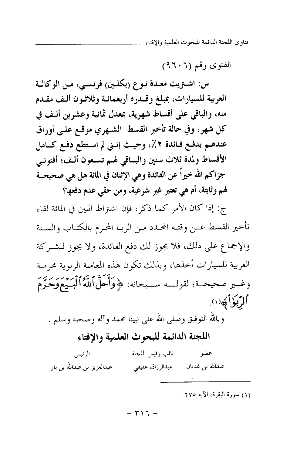 ج: إذا كان الأمر كما ذكر، فإن اشتراط اثنين في المائة لقاء تأخير القسط عن وقته المحدد من الربا المحرم بالكتاب والسنة والإجماع على ذلك، فلا يجوز لك دفع الفائدة، ولا يجوز للشركة العربية للسيارات أخذها، وبذلك تكون هذه المعاملة الربوية محرمة وغير صحيحة؛ لقوله سبحانه: {وَأَحَلَّ اللَّهُ الْبَيْعَ وَحَرَّمَ الرِّبَا} (¬1)