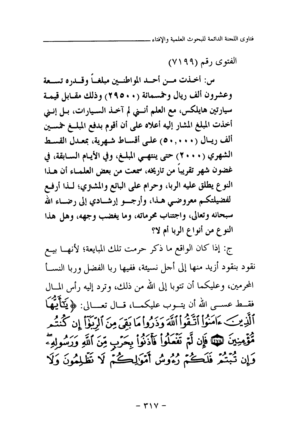 س: أخذت من أحد المواطنين مبلغا وقدره تسعة وعشرون ألف ريال وخمسمائة (29500) وذلك مقابل قيمة سيارتين هايلكس، مع العلم أنني لم آخذ السيارات، بل إنني أخذت المبلغ المشار إليه أعلاه على أن أقوم بدفع المبلغ خمسين ألف ريال (50000) على أقساط شهرية، بمعدل القسط الشهري (2000) حتى ينتهي المبلغ، وفي الأيام السابقة، في غضون شهر تقريبا من تاريخه، سمعت من بعض العلماء أن هذا النوع يطلق عليه الربا، وحرام على البائع والمشتري؛ لذا أرفع لفضيلتكم معروضي هذا، وأرجو إرشادي إلى رضاء الله سبحانه وتعالى، واجتناب محرماته، وما يغضب وجهه، وهل هذا النوع من أنواع الربا أم لا؟