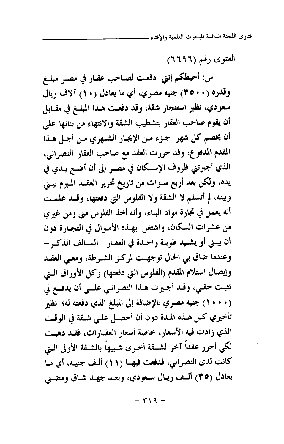 س: أحيطكم إنني دفعت لصاحب عقار في مصر مبلغ وقدره (3500) جنيه مصري، أي ما يعادل (10) آلاف ريال سعودي، نظير استئجار شقة، وقد دفعت هذا المبلغ في مقابل أن يقوم صاحب العقار بتشطيب الشقة والانتهاء من بنائها على أن يخصم كل شهر جزء من الإيجار الشهري من أجل هذا المقدم المدفوع، وقد حررت العقد مع صاحب العقار النصراني، الذي أجبرتني ظروف الإسكان في مصر إلى أن أضع يدي في يده، ولكن بعد أربع سنوات من تاريخ تحرير العقد المبرم بيني وبينه، لم أتسلم لا الشقة ولا الفلوس التي دفعتها، وقد علمت أنه يعمل في تجارة مواد البناء، وأنه أخذ الفلوس مني ومن غيري من عشرات السكان، واشتغل بهذه الأموال في التجارة دون أن يبني أو يشيد طوبة واحدة في العقار -السالف الذكر- وعندما ضاق بي الحال توجهت لمركز الشرطة، ومعي العقد وإيصال استلام المقدم (الفلوس التي دفعتها) وكل الأوراق التي تثبت حقي، وقد أجبرت هذا النصراني على أن يدفع لي (1000) جنيه مصري بالإضافة إلى المبلغ الذي دفعته له؛ نظير تأخيري كل هذه المدة دون أن أحصل على شقة في الوقت الذي زادت فيه الأسعار، خاصة أسعار العقارات، فقد ذهبت لكي أحرر عقدا آخر لشقة أخرى شبيها بالشقة الأولى التي كانت لدى النصراني، فدفعت فيها (11) ألف جنيه، أي ما يعادل (35) ألف ريال سعودي، وبعد جهد شاق ومضني