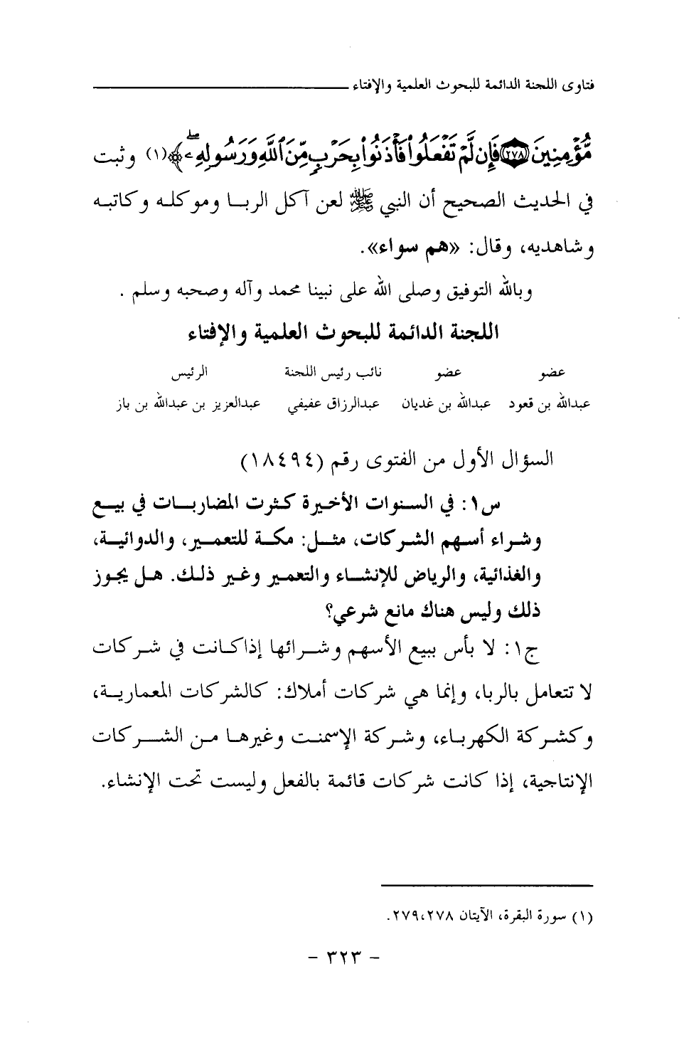 ج1: لا بأس ببيع الأسهم وشرائها إذا كانت في شركات لا تتعامل بالربا، وإنما هي شركات أملاك: كالشركات المعمارية، وكشركة الكهرباء، وشركة الأسمنت وغيرها من الشركات الإنتاجية، إذا كانت شركات قائمة بالفعل وليست تحت الإنشاء.