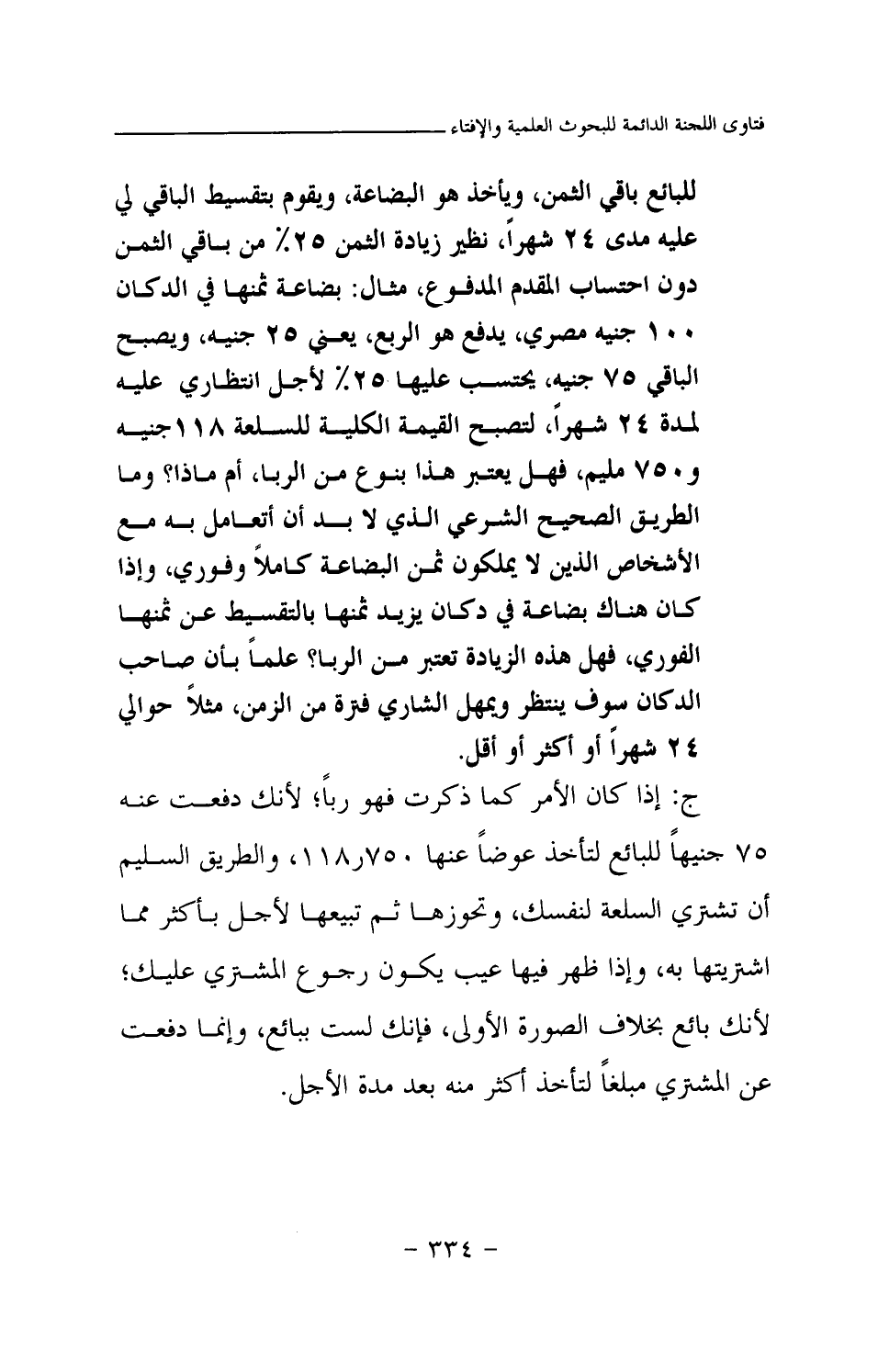 للبائع باقي الثمن، ويأخذ هو البضاعة، ويقوم بتقسيط الباقي لي عليه مدى 24 شهرا، نظير زيادة الثمن 25% من باقي الثمن دون احتساب المقدم المدفوع، مثال: بضاعة ثمنها في الدكان 100 جنيه مصري، يدفع هو الربع، يعني 25 جنيه، ويصبح الباقي 75 جنيه، يحتسب عليها 25% لأجل انتظاري عليه لمدة 24 شهرا، لتصبح القيمة الكلية للسلعة 118 جنيه و750 مليم، فهل يعتبر هذا بنوع من الربا، أم ماذا؟ وما الطريق الصحيح الشرعي الذي لا بد أن أتعامل به مع الأشخاص الذين لا يملكون ثمن البضاعة كاملا وفوري، وإذا كان هناك بضاعة في دكان يزيد ثمنها بالتقسيط عن ثمنها الفوري، فهل هذه الزيادة تعتبر من الربا؟ علما بأن صاحب الدكان سوف ينتظر ويمهل الشاري فترة من الزمن، مثلا حوالي 24 شهرا أو أكثر أو أقل.