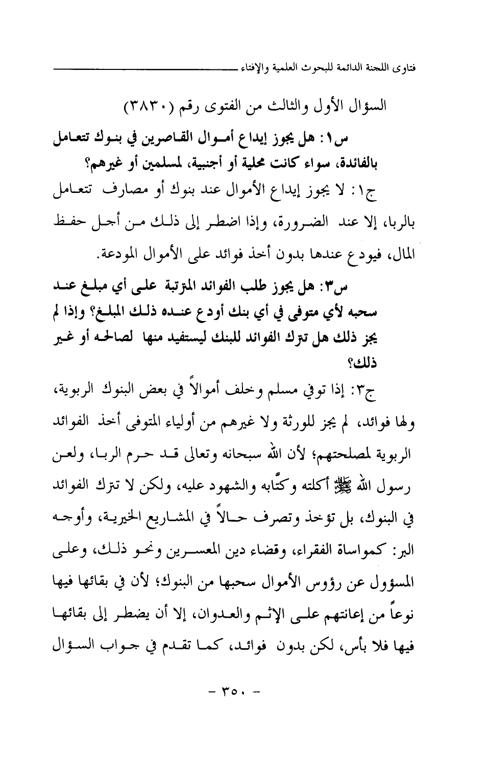 ج3: إذا توفي مسلم وخلف أموالا في بعض البنوك الربوية، ولها فوائد، لم يجز للورثة ولا غيرهم من أولياء المتوفى أخذ الفوائد الربوية لمصلحتهم؛ لأن الله سبحانه وتعالى قد حرم الربا، ولعن رسول الله صلى الله عليه وسلم أكلته وكتابه والشهود عليه، ولكن لا تترك الفوائد في البنوك، بل تؤخذ وتصرف حالا في المشاريع الخيرية، وأوجه البر: كمواساة الفقراء، وقضاء دين المعسرين ونحو ذلك، وعلى المسئول عن رءوس الأموال سحبها من البنوك؛ لأن في بقائها فيها نوعا من إعانتهم على الإثم والعدوان، إلا أن يضطر إلى بقائها فيها فلا بأس، لكن بدون فوائد، كما تقدم في جواب السؤال الأول.