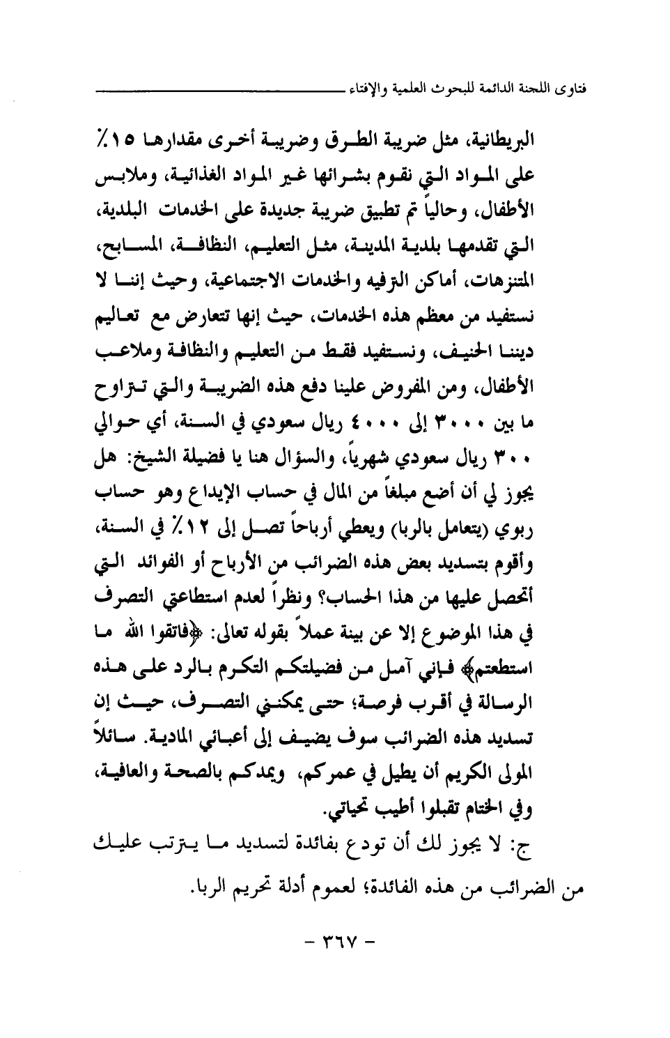 البريطانية، مثل ضريبة الطرق وضريبة أخرى مقدارها 15% على المواد التي نقوم بشرائها غير المواد الغذائية، وملابس الأطفال، وحاليا تم تطبيق ضريبة جديدة على الخدمات البلدية، التي تقدمها بلدية المدينة، مثل التعليم، النظافة، المسابح، المتنزهات، أماكن الترفيه والخدمات الاجتماعية، وحيث إننا لا نستفيد من معظم هذه الخدمات، حيث إنها تتعارض مع تعاليم ديننا الحنيف، ونستفيد فقط من التعليم والنظافة وملاعب الأطفال، ومن المفروض علينا دفع هذه الضريبة والتي تتراوح ما بين 3000 إلى 4000 ريال سعودي في السنة، أي حوالي 300 ريال سعودي شهريا، والسؤال هنا يا فضيلة الشيخ: هل يجوز لي أن أضع مبلغا من المال في حساب الإيداع وهو حساب ربوي (يتعامل بالربا) ويعطي أرباحا تصل إلى 12% في السنة، وأقوم بتسديد بعض هذه الضرائب من الأرباح أو الفوائد التي أتحصل عليها من هذا الحساب؟ ونظرا لعدم استطاعتي التصرف في هذا الموضوع إلا عن بينة عملا بقوله تعالى: {فَاتَّقُوا اللَّهَ مَا اسْتَطَعْتُمْ} (¬1) فإني آمل من فضيلتكم التكرم بالرد على هذه الرسالة في أقرب فرصة؛ حتى يمكنني التصرف، حيث إن تسديد هذه الضرائب سوف يضيف إلى أعبائي المادية. سائلا المولى الكريم أن يطيل في عمركم، ويمدكم بالصحة والعافية، وفي الختام تقبلوا أطيب تحياتي.