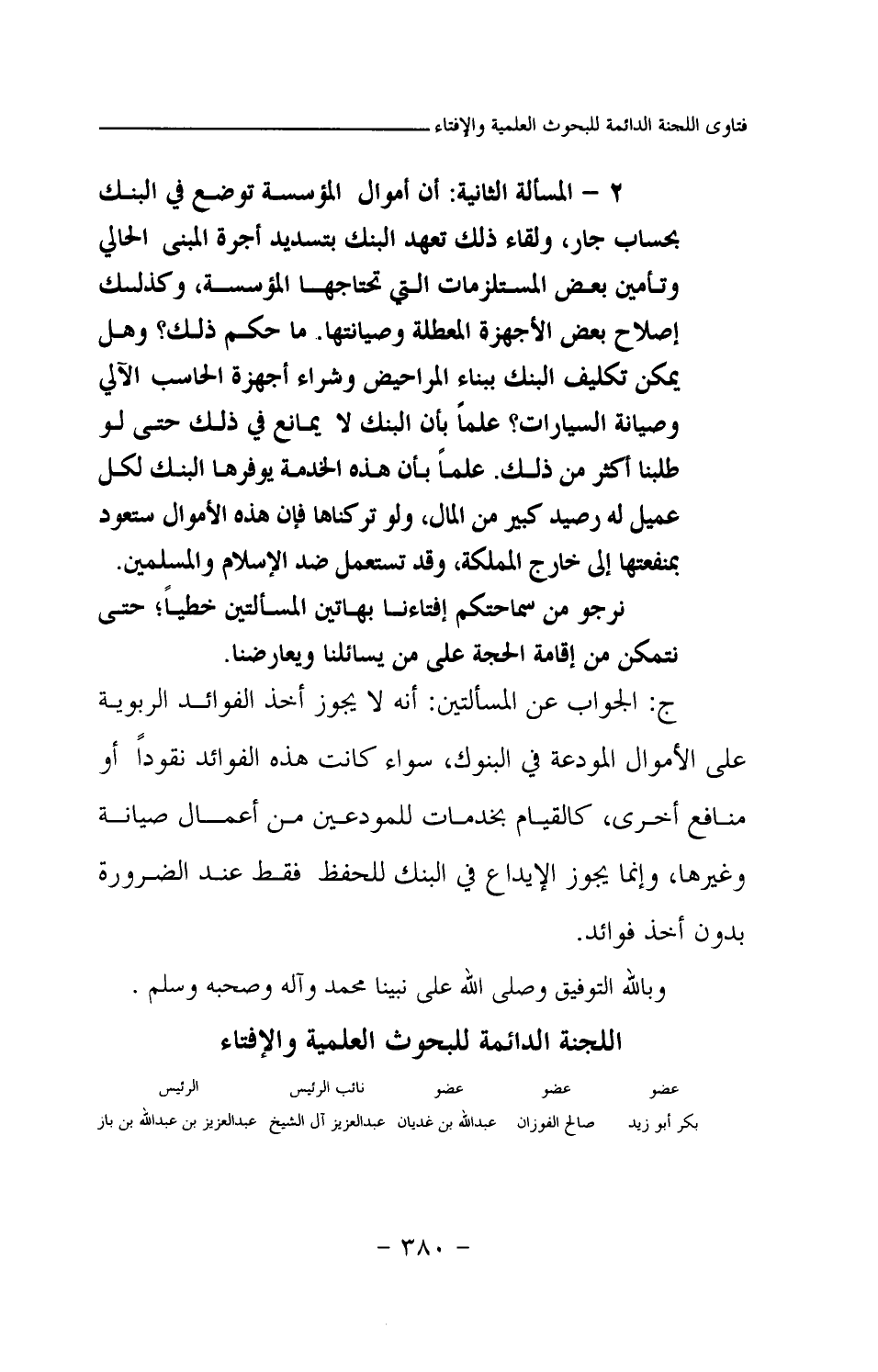 2 - المسألة الثانية: أن أموال المؤسسة توضع في البنك بحساب جار، ولقاء ذلك تعهد البنك بتسديد أجرة المبنى الحالي وتأمين بعض المستلزمات التي تحتاجها المؤسسة، وكذلك إصلاح بعض الأجهزة المعطلة وصيانتها. ما حكم ذلك؟ وهل يمكن تكليف البنك ببناء المراحيض وشراء أجهزة الحاسب الآلي وصيانة السيارات؟ علما بأن البنك لا يمانع في ذلك حتى لو طلبنا أكثر من ذلك. علما بأن هذه الخدمة يوفرها البنك لكل عميل له رصيد كبير من المال، ولو تركناها فإن هذه الأموال ستعود بمنفعتها إلى خارج المملكة، وقد تستعمل ضد الإسلام والمسلمين.