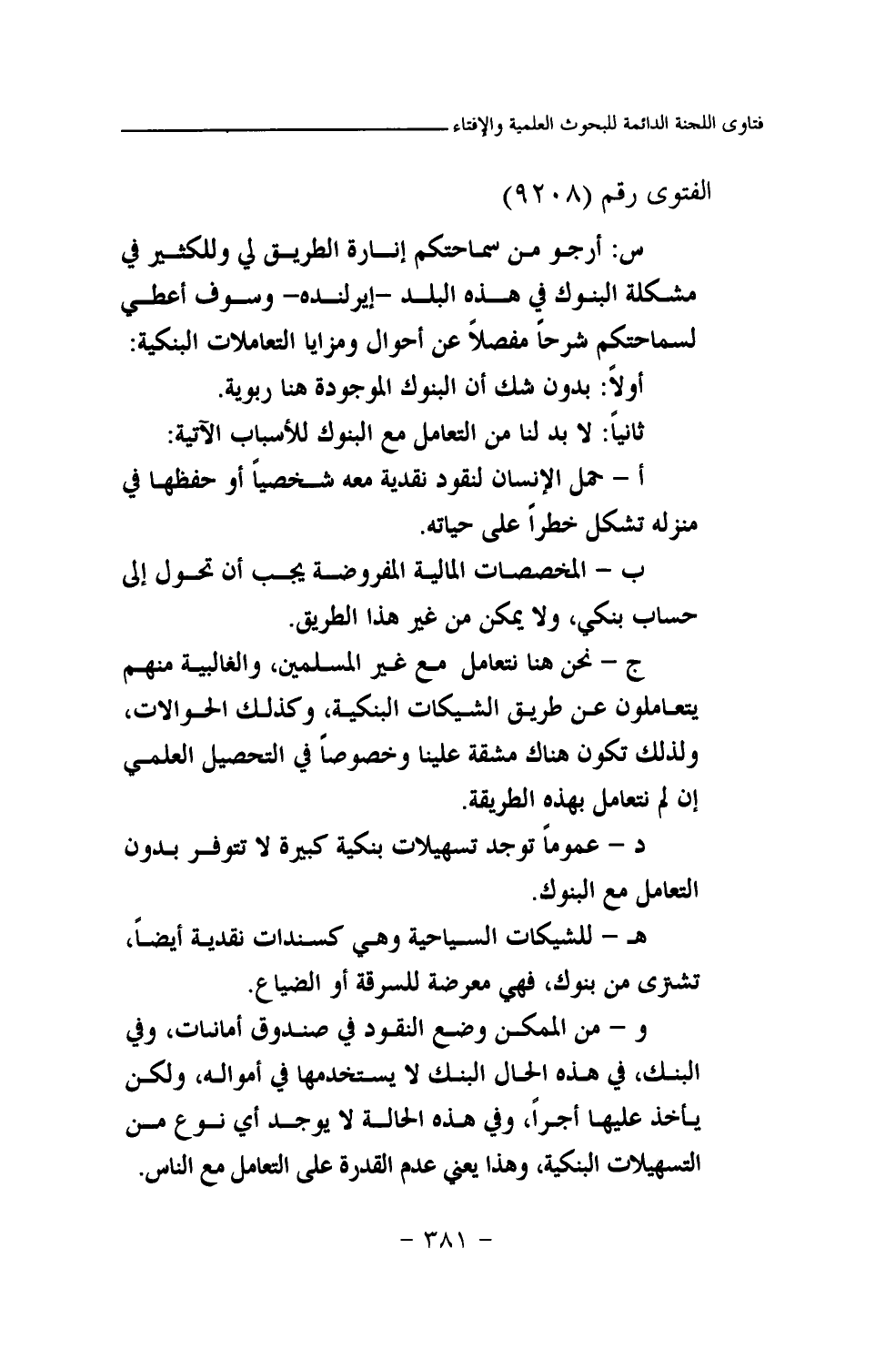 س: أرجو من سماحتكم إنارة الطريق لي وللكثير في مشكلة البنوك في هذه البلد - إيرلنده - وسوف أعطي لسماحتكم شرحا مفصلا عن أحوال ومزايا التعاملات البنكية: