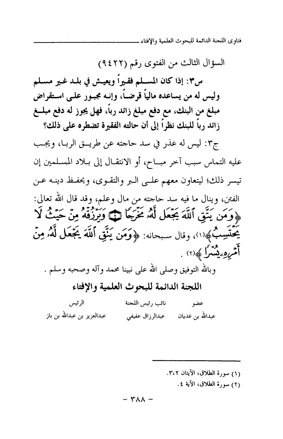 ج3: ليس له عذر في سد حاجته عن طريق الربا، ويجب عليه التماس سبب آخر مباح، أو الانتقال إلى بلاد المسلمين إن تيسر ذلك؛ ليتعاون معهم على البر والتقوى، ويحفظ دينه عن الفتن، وينال ما فيه سد حاجته من مال وعلم، وقد قال الله تعالى: {وَمَنْ يَتَّقِ اللَّهَ يَجْعَلْ لَهُ مَخْرَجًا} (¬1) {وَيَرْزُقْهُ مِنْ حَيْثُ لَا يَحْتَسِبُ} (¬2) وقال سبحانه: {وَمَنْ يَتَّقِ اللَّهَ يَجْعَلْ لَهُ مِنْ أَمْرِهِ يُسْرًا} (¬3)