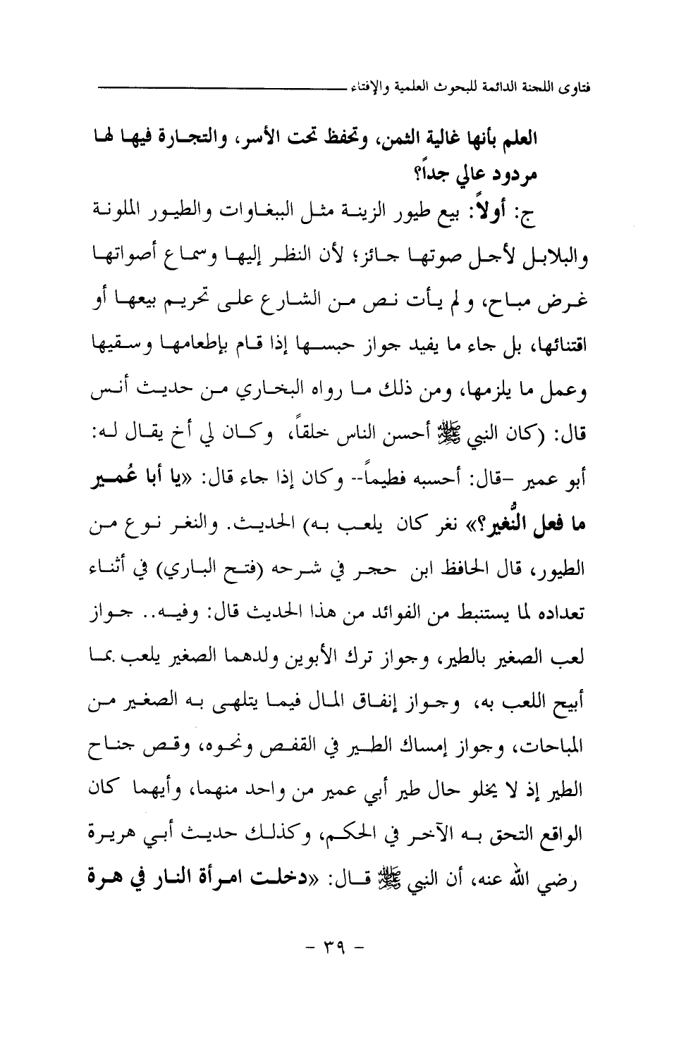 ج: أولا: بيع طيور الزينة مثل الببغاوات والطيور الملونة والبلابل لأجل صوتها جائز؛ لأن النظر إليها وسماع أصواتها غرض مباح، ولم يأت نص من الشارع على تحريم بيعها أو اقتنائها، بل جاء ما يفيد جواز حبسها إذا قام بإطعامها وسقيها وعمل ما يلزمها، ومن ذلك ما رواه البخاري من حديث أنس قال: «كان النبي صلى الله عليه وسلم أحسن الناس خلقا، وكان لي أخ يقال له: أبو عمير -قال: أحسبه فطيما - وكان إذا جاء قال: "يا أبا عمير ما فعل النغير؟ " نغر كان يلعب به (¬1) » الحديث. والنغر نوع من الطيور، قال الحافظ ابن حجر في شرحه (فتح الباري) في أثناء تعداده لما يستنبط من الفوائد من هذا الحديث قال: وفيه.. جواز لعب الصغير بالطير، وجواز ترك الأبوين ولدهما الصغير يلعب. بما أبيح اللعب به، وجواز إنفاق المال فيما يتلهى به الصغير من المباحات، وجواز إمساك الطير في القفص ونحوه، وقص جناح الطير إذ لا يخلو حال طير أبي عمير من واحد منهما، وأيهما كان الواقع التحق به الآخر في الحكم، وكذلك حديث أبي هريرة رضي الله عنه، أن النبي صلى الله عليه وسلم قال: «دخلت امرأة النار في هرة حبستها، لا هي أطعمتها وسقتها ولا هي تركتها تأكل من خشاش الأرض (¬2) »