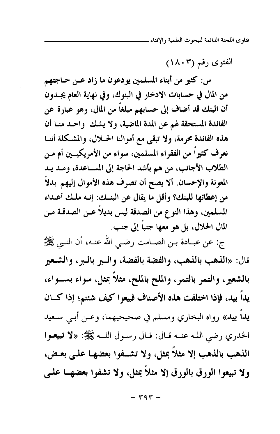 ج: عن عبادة بن الصامت رضي الله عنه، أن النبي صلى الله عليه وسلم قال: «الذهب بالذهب، والفضة بالفضة، والبر بالبر، والشعير بالشعر، والتمر بالتمر، والملح بالملح، مثلا بمثل، سواء بسواء، يدا بيد، فإذا اختلفت هذه الأصناف فبيعوا كيف شئتم؛ إذا كان يدا بيد (¬1) » رواه البخاري ومسلم في صحيحيهما وعن أبي سعيد الخدري رضي الله عنه قال: قال رسول الله صلى الله عليه وسلم: «لا تبيعوا الذهب بالذهب إلا مثلا بمثل، ولا تشفوا بعضها على بعض، ولا تبيعوا الورق بالورق إلا مثلا بمثل، ولا تشفوا بعضها على بعض، ولا تبيعوا منها غائبا بناجز (¬2) » ،