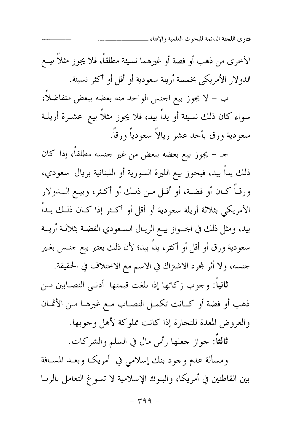الأخرى من ذهب أو فضة أو غيرهما نسيئة مطلقا، فلا يجوز مثلا بيع الدولار الأمريكي بخمسة أريلة سعودية أو أقل أو أكثر نسيئة. ب- لا يجوز بيع الجنس الواحد منه بعضه ببعض متفاضلا، سواء كان ذلك نسيئة أو يدا بيد، فلا يجوز مثلا بيع عشرة أريلة سعودية ورق بأحد عشر ريالا سعوديا ورقا. جـ- يجوز بيع بعضه ببعض من غير جنسه مطلقا، إذا كان ذلك يدا بيد، فيجوز بيع الليرة السورية أو اللبنانية بريال سعودي، ورقا كان أو فضة، أو أقل من ذلك أو أكثر، وبيع الدولار الأمريكي بثلاثة أريلة سعودية أو أقل أو أكثر إذا كان ذلك يدا بيد، ومثل ذلك في الجواز بيع الريال السعودي الفضة بثلاثة أريلة سعودية ورق أو أقل أو أكثر، يدا بيد؛ لأن ذلك يعتبر بيع جنس بغير جنسه، ولا أثر لمجرد الاشتراك في الاسم مع الاختلاف في الحقيقة. ثانيا: وجوب زكاتها إذا بلغت قيمتها أدنى النصابين من ذهب أو فضة أو كانت تكمل النصاب مع غيرها من الأثمان والعروض المعدة للتجارة إذا كانت مملوكة لأهل وجوبها. ثالثا: جواز جعلها رأس مال في السلم والشركات.