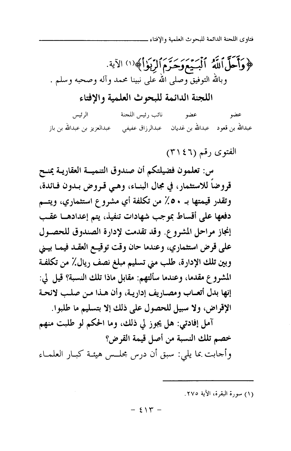 س: تعلمون فضيلتكم أن صندوق التنمية العقارية يمنح قروضا للاستثمار، في مجال البناء، وهي قروض بدون فائدة، وتقدر قيمتها بـ 50% من تكلفة أي مشروع استثماري، ويتم دفعها على أقساط بموجب شهادات تنفيذ، يتم إعدادها عقب إنجاز مراحل المشروع. وقد تقدمت لإدارة الصندوق للحصول على قرض استثماري، وعندما حان وقت توقيع العقد فيما بيني وبين تلك الإدارة، طلب مني تسليم مبلغ نصف ريال% من تكلفة المشروع مقدما، وعندما سألتهم: مقابل ماذا تلك النسبة؟ قيل لي: إنها بدل أتعاب ومصاريف إدارية، وأن هذا من صلب لائحة الإقراض، ولا سبيل للحصول على ذلك إلا بتسليم ما طلبوا.