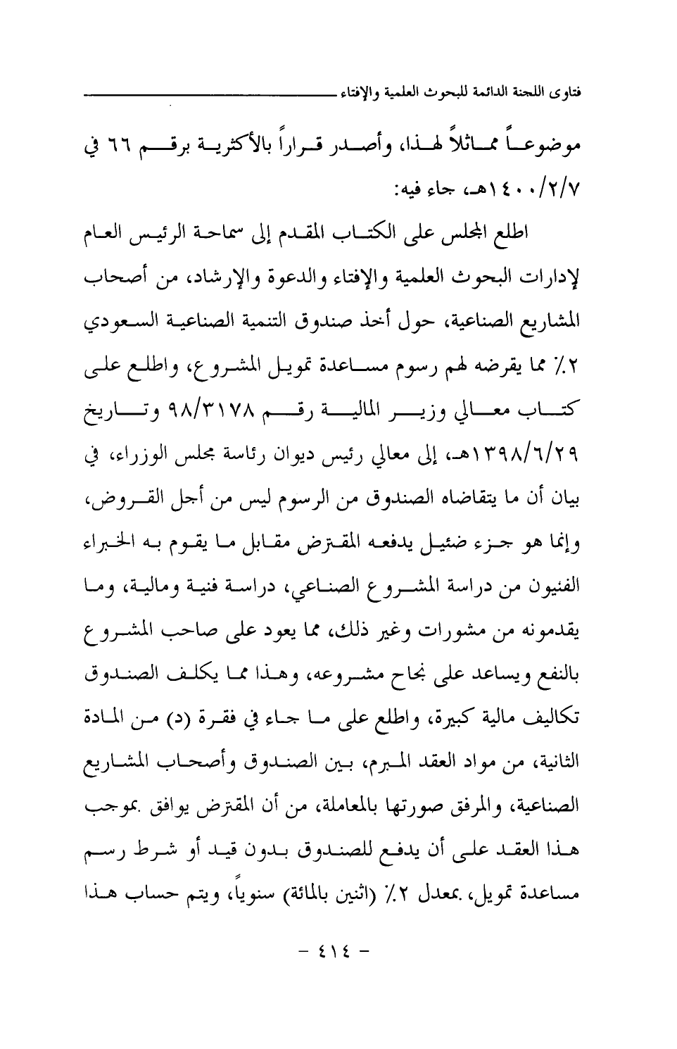 اطلع المجلس على الكتاب المقدم إلى سماحة الرئيس العام لإدارات البحوث العلمية والإفتاء والدعوة والإرشاد، من أصحاب المشاريع الصناعية، حول أخذ صندوق التنمية الصناعية السعودي 2% مما يقرضه لهم رسوم مساعدة تمويل المشروع،