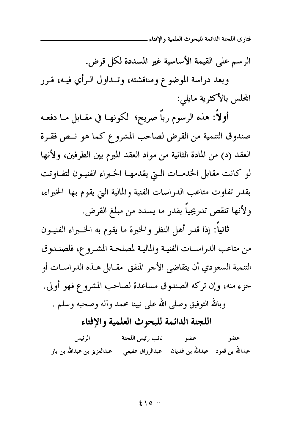 وبعد دراسة الموضوع ومناقشته، وتداول الرأي فيه، قرر المجلس بالأكثرية ما يلي: أولا: هذه الرسوم ربا صريح؛ لكونها في مقابل ما دفعه صندوق التنمية من القرض لصاحب المشروع كما هو نص فقرة العقد (د) من المادة الثانية من مواد العقد المبرم بين الطرفين، ولأنها لو كانت مقابل الخدمات التي يقدمها الخبراء الفنيون لتفاوتت بقدر تفاوت متاعب الدراسات الفنية والمالية التي يقوم بها الخبراء، ولأنها تنقص تدريجيا بقدر ما يسدد من مبلغ القرض. ثانيا: إذا قدر أهل النظر والخبرة ما يقوم به الخبراء الفنيون من متاعب الدراسات الفنية والمالية لمصلحة المشروع، فلصندوق التنمية السعودي أن يتقاضى الأجر المنفق مقابل هذه الدراسات أو جزء منه، وإن تركه الصندوق مساعدة لصاحب المشروع فهو أولى.