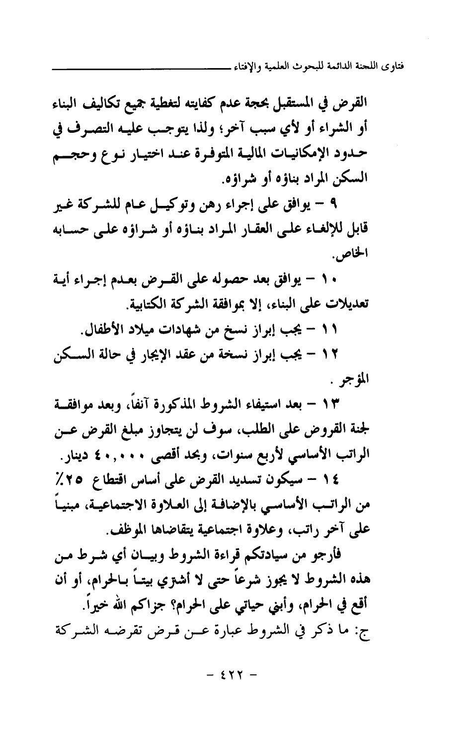 فأرجو من سيادتكم قراءة الشروط وبيان أي شرط من هذه الشروط لا يجوز شرعا حتى لا أشتري بيتا بالحرام، أو أن أقع في الحرام، وأبني حياتي على الحرام؟ جزاكم الله خيرا. ج: ما ذكر في الشروط عبارة عن قرض تقرضه الشركة