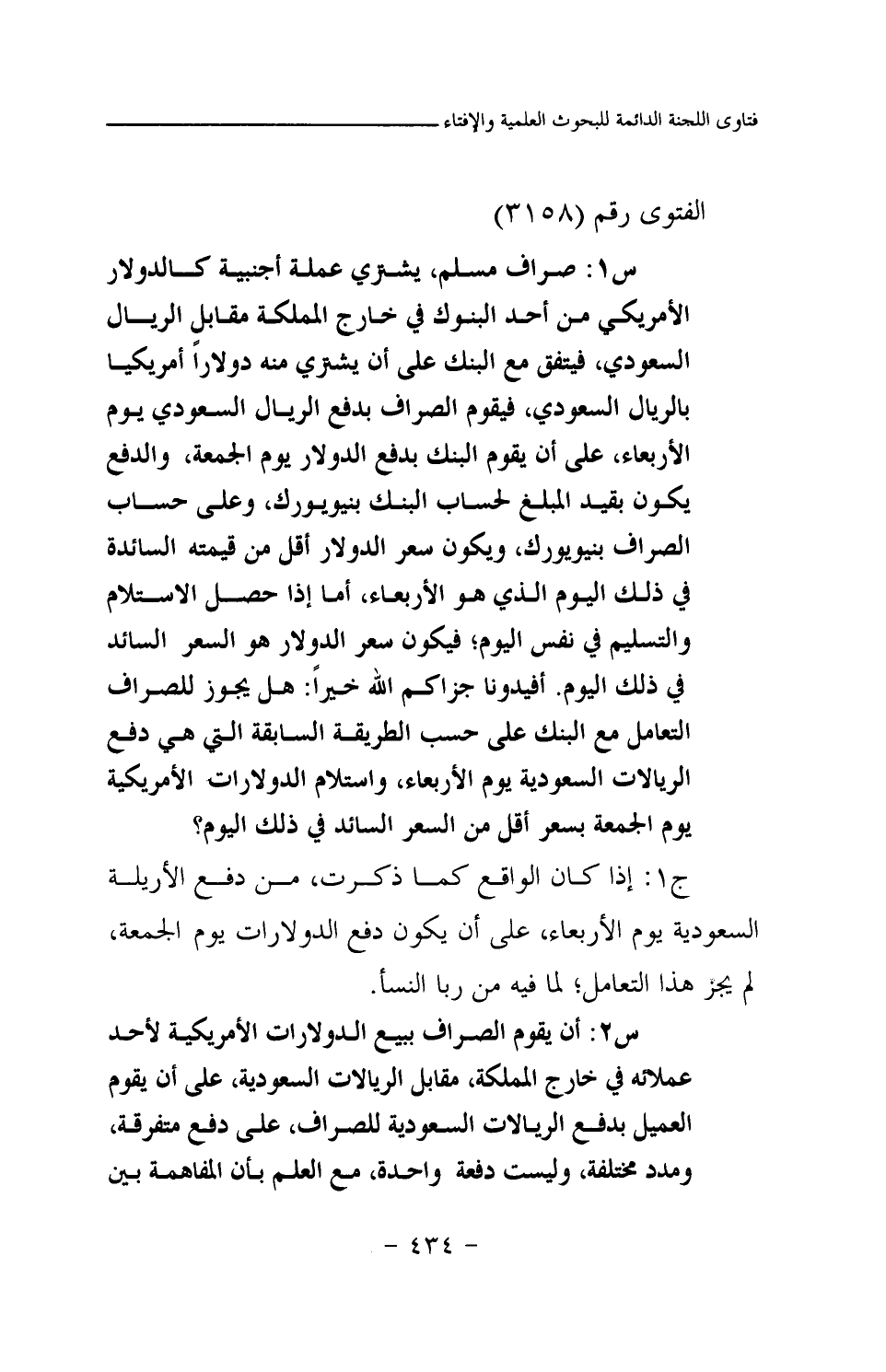 س1: صراف مسلم، يشتري عملة أجنبية كالدولار الأمريكي من أحد البنوك في خارج المملكة مقابل الريال السعودي، فيتفق مع البنك على أن يشتري منه دولارا أمريكيا بالريال السعودي، فيقوم الصراف بدفع الريال السعودي يوم الأربعاء، على أن يقوم البنك بدفع الدولار يوم الجمعة، والدفع يكون بقيد المبلغ لحساب البنك بنيويورك، وعلى حساب الصراف بنيويورك، ويكون سعر الدولار أقل من قيمته السائدة في ذلك اليوم الذي هو الأربعاء، أما إذا حصل الاستلام والتسليم في نفس اليوم؛ فيكون سعر الدولار هو السعر السائد في ذلك اليوم.