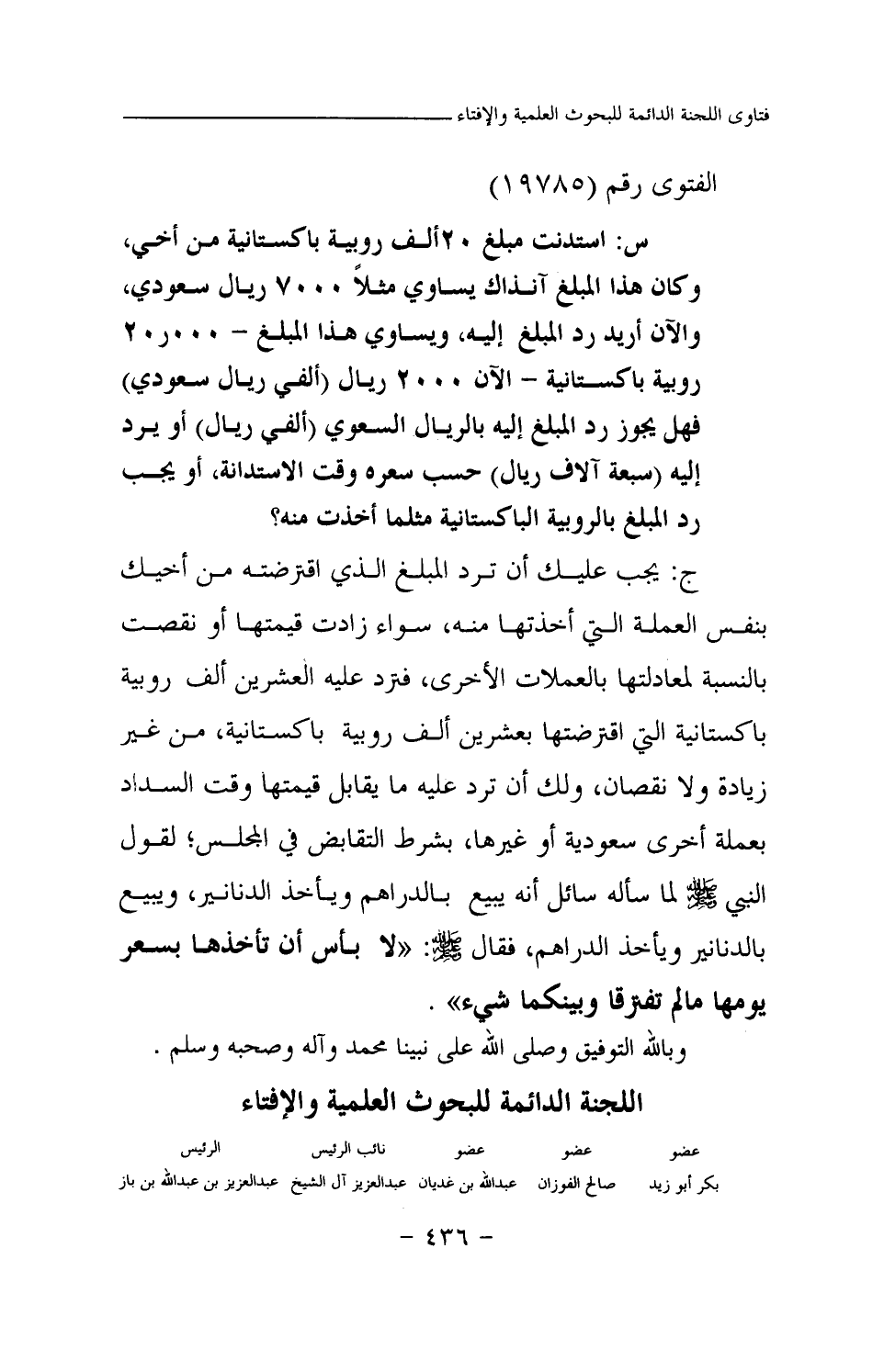 ج: يجب عليك أن ترد المبلغ الذي اقترضته من أخيك بنفس العملة التي أخذتها منه، سواء زادت قيمتها أو نقصت بالنسبة لمعادلتها بالعملات الأخرى، فترد عليه العشرين ألف روبية باكستانية التي اقترضتها بعشرين ألف روبية باكستانية، من غير زيادة ولا نقصان، ولك أن ترد عليه ما يقابل قيمتها وقت السداد بعملة أخرى سعودية أو غيرها، بشرط التقابض في المجلس؛ لقول النبي صلى الله عليه وسلم لما سأله سائل أنه يبيع بالدراهم ويأخذ الدنانير، ويبيع بالدنانير ويأخذ الدراهم، فقال صلى الله عليه وسلم: «لا بأس أن تأخذها بسعر يومها ما لم تفترقا وبينكما شيء (¬1) » .