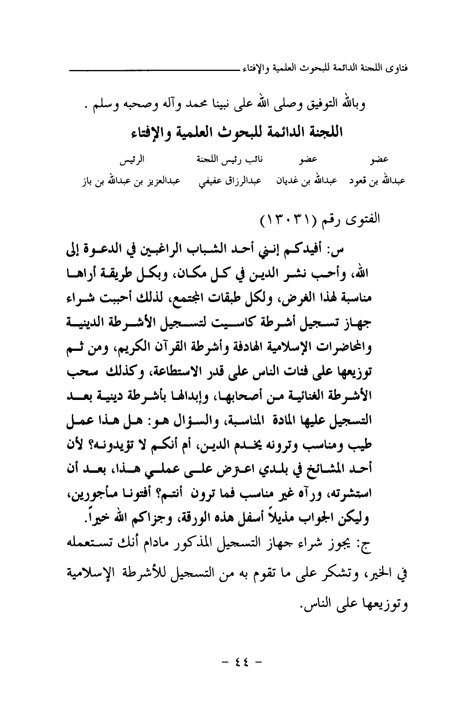 ج: يجوز شراء جهاز التسجيل المذكور ما دام أنك تستعمله في الخير، وتشكر على ما تقوم به من التسجيل للأشرطة الإسلامية وتوزيعها على الناس.