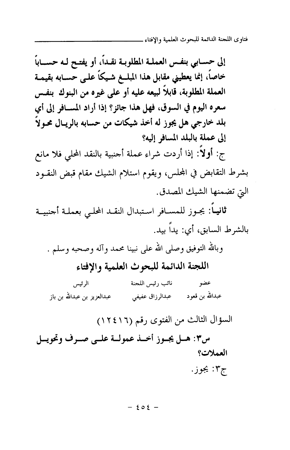 إلى حسابي بنفس العملة المطلوبة نقدا، أو يفتح له حسابا خاصا، إنما يعطيني مقابل هذا المبلغ شيكا على حسابه بقيمة العملة المطلوبة، قابلا لبيعه عليه أو على غيره من البنوك بنفس سعره اليوم في السوق، فهل هذا جائز؟ إذا أراد المسافر إلى أي بلد خارجي هل يجوز له أخذ شيكات من حسابه بالريال محولا إلى عملة بالبلد المسافر إليه؟