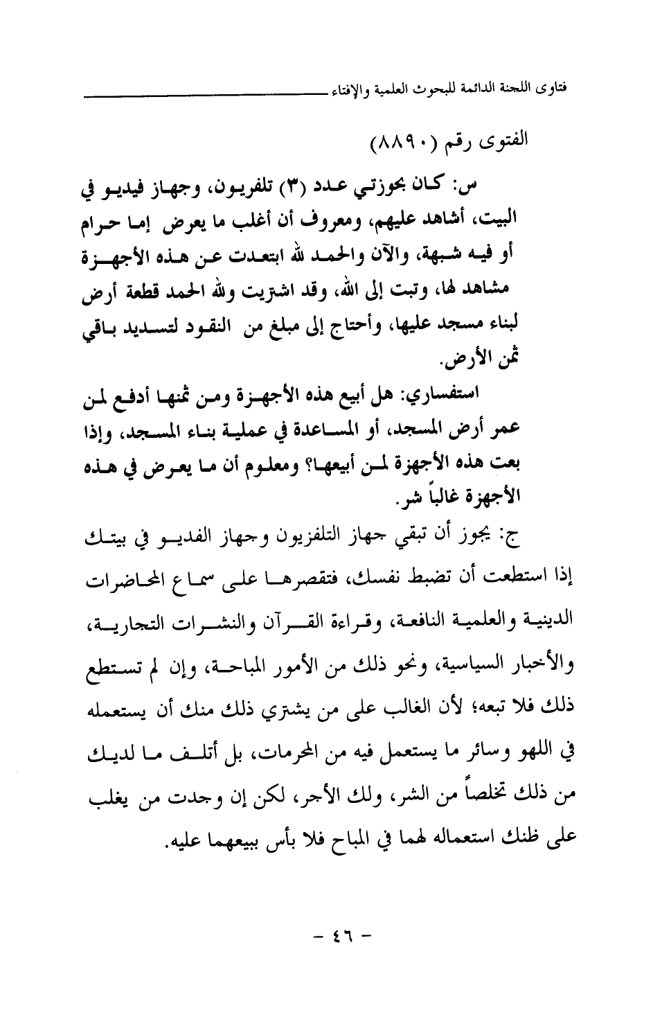ج: يجوز أن تبقي جهاز التلفزيون وجهاز الفيديو في بيتك إذا استطعت أن تضبط نفسك، فتقصرها على سماع المحاضرات الدينية والعلمية النافعة، وقراءة القرآن والنشرات التجارية، والأخبار السياسية، ونحو ذلك من الأمور المباحة، وإن لم تستطع ذلك فلا تبعه؛ لأن الغالب على من يشتري ذلك منك أن يستعمله في اللهو وسائر ما يستعمل فيه من المحرمات، بل أتلف ما لديك من ذلك تخلصا من الشر، ولك الأجر، لكن إن وجدت من يغلب على ظنك استعماله لهما في المباح فلا بأس ببيعهما عليه.