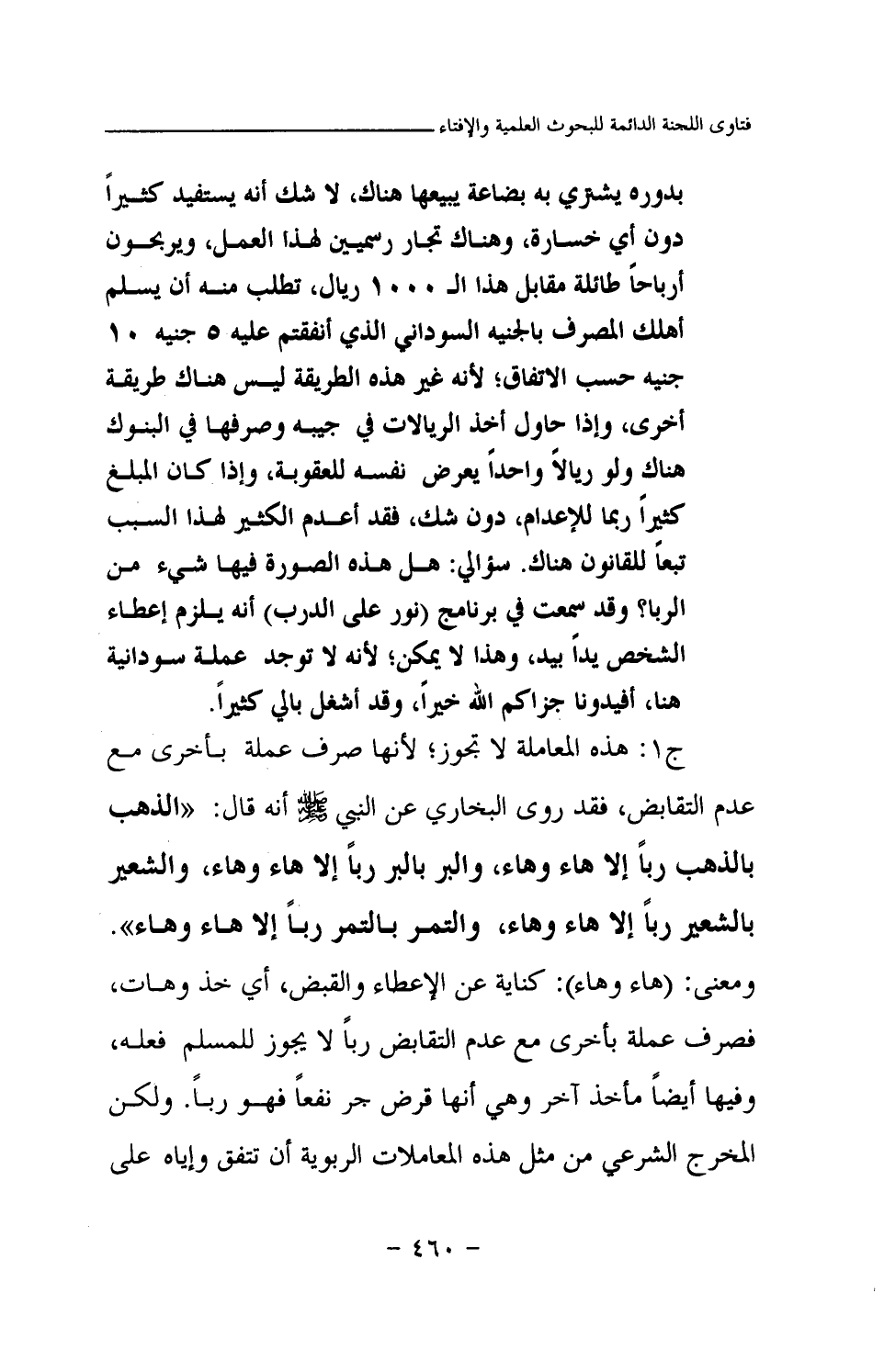 بدوره يشتري به بضاعة يبيعها هناك، لا شك أنه يستفيد كثيرا دون أي خسارة، وهناك تجار رسميين لهذا العمل، ويربحون أرباحا طائلة مقابل هذا الـ 1000 ريال، تطلب منه أن يسلم أهلك المصرف بالجنيه السوداني الذي أنفقتم عليه 5 جنيه 10 جنيه حسب الاتفاق؛ لأنه غير هذه الطريقة ليس هناك طريقة أخرى، وإذا حاول أخذ الريالات في جيبه وصرفها في البنوك هناك ولو ريالا واحدا يعرض نفسه للعقوبة، وإذا كان المبلغ كثيرا ربما للإعدام، دون شك، فقد أعدم الكثير لهذا السبب تبعا للقانون هناك. سؤالي: هل هذه الصورة فيها شيء من الربا؟ وقد سمعت في برنامج (نور على الدرب) أنه يلزم إعطاء الشخص يدا بيد، وهذا لا يمكن؛ لأنه لا توجد عملة سودانية هنا، أفيدونا جزاكم الله خيرا، وقد أشغل بالي كثيرا.