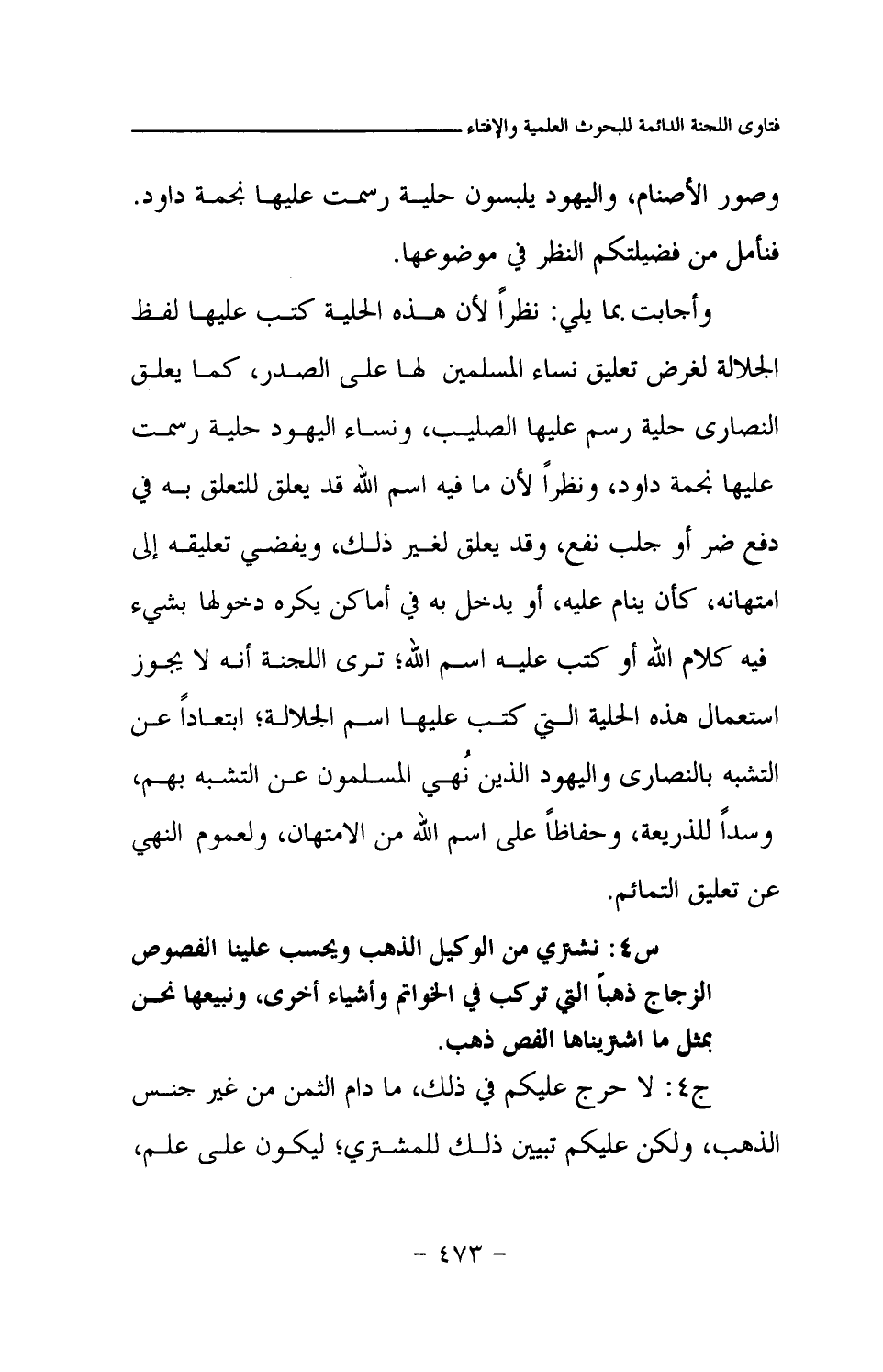 وأجابت بما يلي: نظرا لأن هذه الحلية كتب عليها لفظ الجلالة لغرض تعليق نساء المسلمين لها على الصدر، كما يعلق النصارى حلية رسم عليها الصليب، ونساء اليهود حلية رسمت عليها نجمة داود، ونظرا لأن ما فيه اسم الله قد يعلق للتعلق به في دفع ضر أو جلب نفع، وقد يعلق لغير ذلك، ويفضي تعليقه إلى امتهانه، كأن ينام عليه، أو يدخل به في أماكن يكره دخولها بشيء فيه كلام الله أو كتب عليه اسم الله؛ ترى اللجنة أنه لا يجوز استعمال هذه الحلية التي كتب عليها اسم الجلالة؛ ابتعادا عن التشبه بالنصارى واليهود الذين نهي المسلمون عن التشبه بهم، وسدا للذريعة، وحفاظا على اسم الله من الامتهان، ولعموم النهي عن تعليق التمائم.