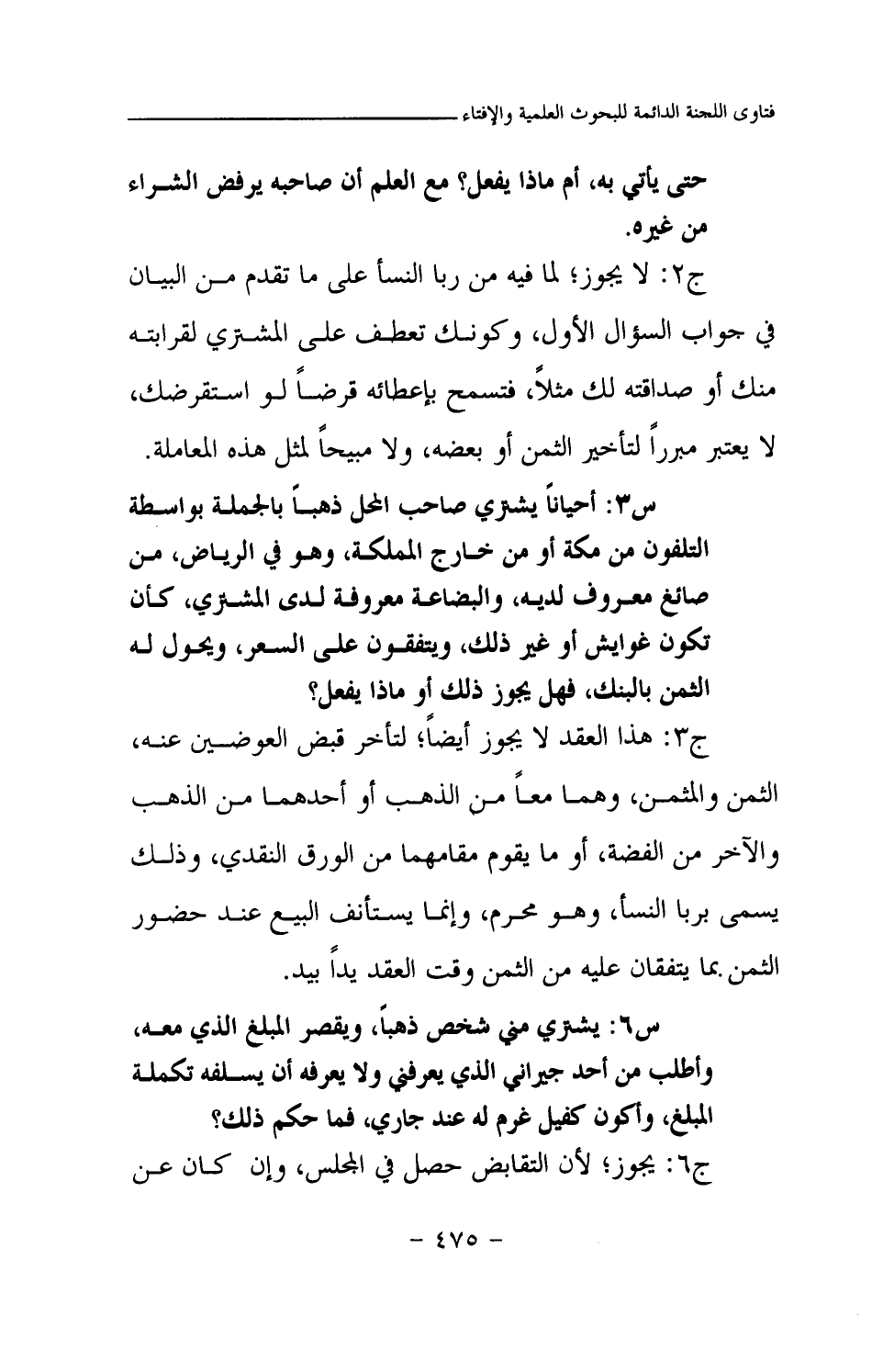ج3: هذا العقد لا يجوز أيضا؛ لتأخر قبض العوضين عنه، الثمن والمثمن، وهما معا من الذهب أو أحدهما من الذهب والآخر من الفضة، أو ما يقوم مقامهما من الورق النقدي، وذلك يسمى بربا النسأ، وهو محرم، وإنما يستأنف البيع عند حضور الثمن بما يتفقان عليه من الثمن وقت العقد يدا بيد.
