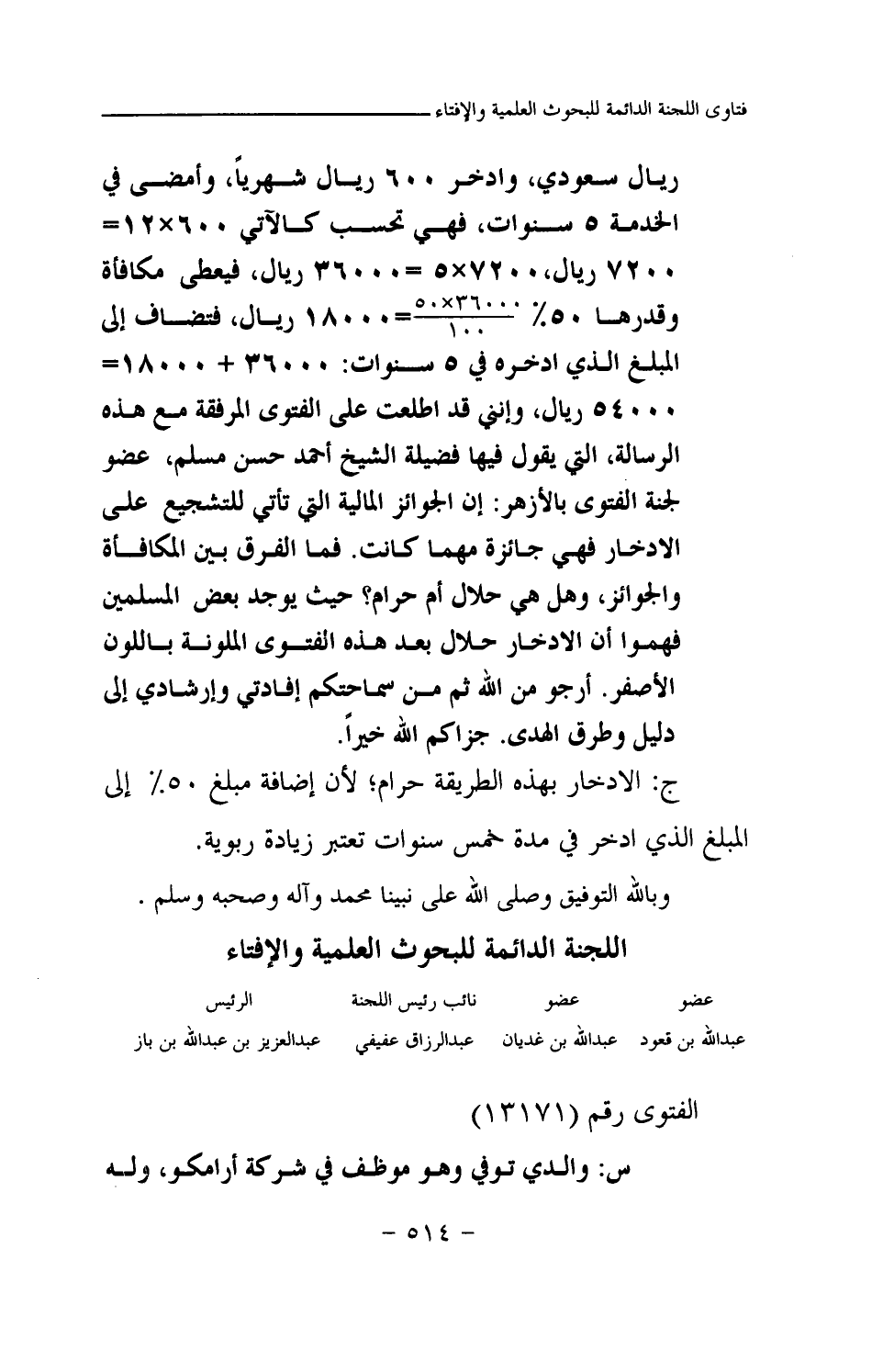 ريال سعودي، وادخر 600 ريال شهريا، وأمضى في الخدمة 5 سنوات، فهي تحسب كالآتي: 600 × 12= 7200 ريال، 7200 ريال × 5= 36000 ريال فيعطى مكافأة وقدرها 50% 36000 × 50 ÷ 100= 18000 ريال فتضاف إلى المبلغ الذي ادخره في 5 سنوات: 36000 + 18000 = 54000 ريال، وإنني قد اطلعت على الفتوى المرفقة مع هذه الرسالة، التي يقول فيها فضيلة الشيخ أحمد حسن مسلم، عضو لجنة الفتوى بالأزهر: إن الجوائز المالية التي تأتي للتشجيع على الادخار فهي جائزة مهما كانت. فما الفرق بين المكافأة والجوائز، وهل هي حلال أم حرام؟ حيث يوجد بعض المسلمين فهموا أن الادخار حلال بعد هذه الفتوى الملونة باللون الأصفر.