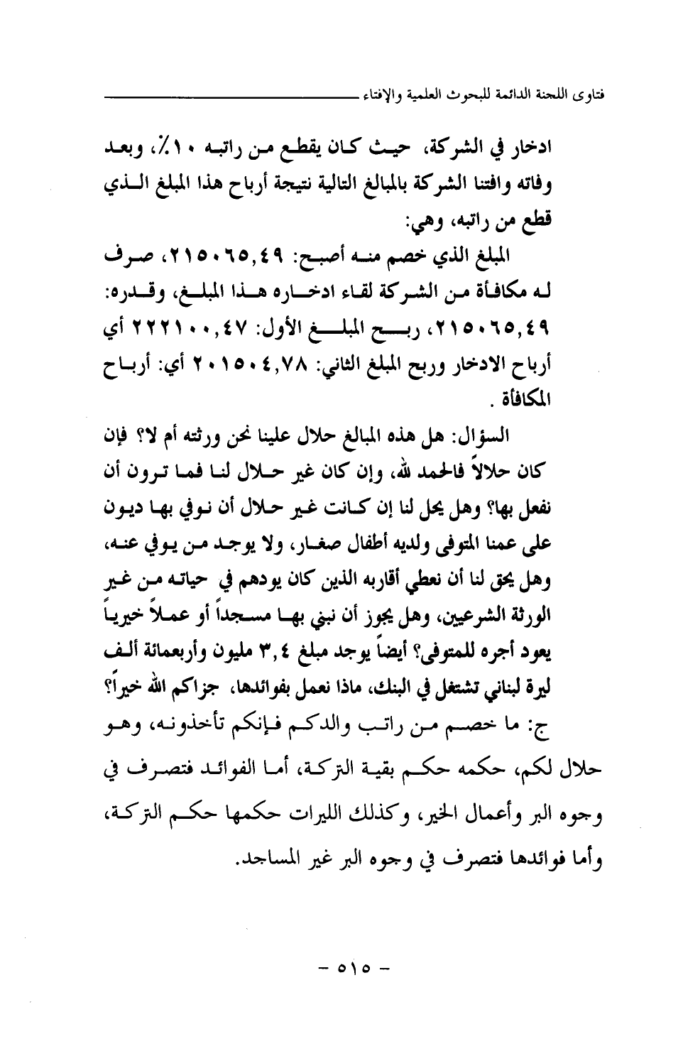 ادخار في الشركة، حيث كان يقطع من راتبه 10%، وبعد وفاته وافتنا الشركة بالمبالغ التالية نتيجة أرباح هذا المبلغ الذي قطع من راتبه، وهي: المبلغ الذي خصم منه أصبح: 15065.49، صرف له مكافأة من الشركة لقاء ادخاره هذا المبلغ، وقدره: 215065.49، ربح المبلغ الأول: 222100.47 أي أرباح الادخار وربح المبلغ الثاني: 201504.78 أي: أرباح المكافأة.