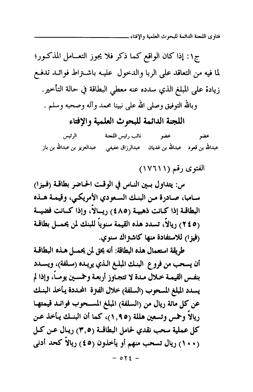 س: يتداول بين الناس في الوقت الحاضر بطاقة (فيزا) سامبا، صادرة من البنك السعودي الأمريكي، وقيمة هذه البطاقة إذا كانت ذهبية (485) ريالا، وإذا كانت فضية (245) ريالا، تسدد هذه القيمة سنويا للبنك لمن يحمل بطاقة (فيزا) للاستفادة منها كاشتراك سنوي. طريقة استعمال هذه البطاقة: أنه يحق لمن يحمل هذه البطاقة أن يسحب من فروع البنك المبلغ الذي يريده (سلفة) ، ويسدد بنفس القيمة خلال مدة لا تتجاوز أربعة وخمسين يوما، وإذا لم يسدد المبلغ المسحوب (السلفة) خلال الفترة المحددة يأخذ البنك عن كل مائة ريال من (السلفة) المبلغ المسحوب فوائد قيمتها ريالا وخمس وتسعين هللة (1.95) ، كما أن البنك يأخذ عن كل عملية سحب نقدي لحامل البطاقة (3.5) ريال عن كل (100) ريال تسحب منهم أو يأخذون (45) ريالا كحد أدنى
