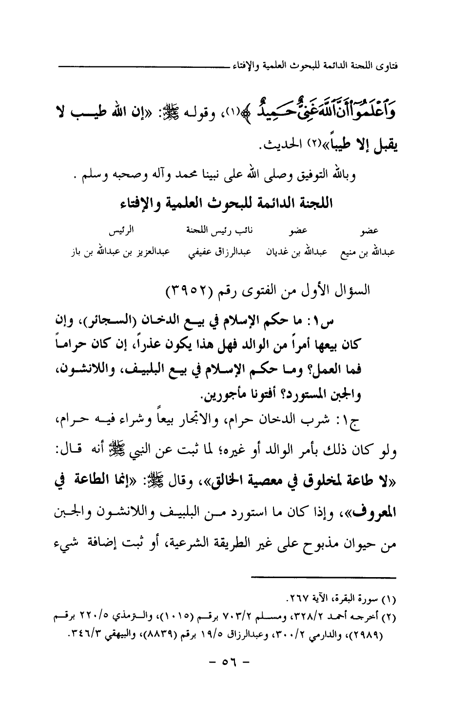 ج1: شرب الدخان حرام، والاتجار بيعا وشراء فيه حرام، ولو كان ذلك بأمر الوالد أو غيره؛ لما ثبت عن النبي صلى الله عليه وسلم أنه قال: «لا طاعة لمخلوق في معصية الخالق (¬1) » ، وقال صلى الله عليه وسلم: «إنما الطاعة في المعروف (¬2) » ، وإذا كان ما استورد من البلبيف واللانشون والجبن من حيوان مذبوح على غير الطريقة الشرعية، أو ثبت إضافة شيء