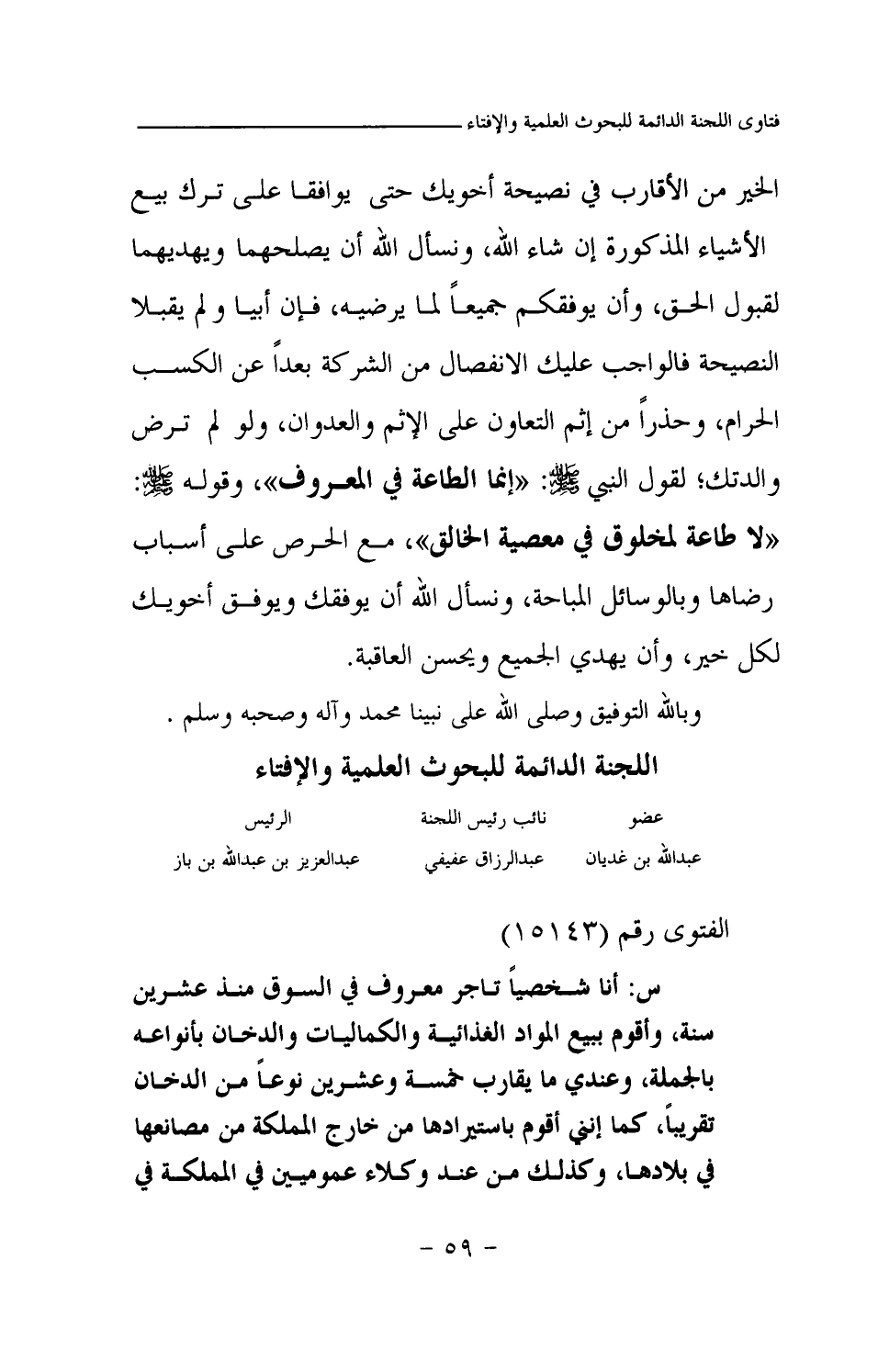 س: أنا شخصيا تاجر معروف في السوق منذ عشرين سنة، وأقوم ببيع المواد الغذائية والكماليات والدخان بأنواعه بالجملة، وعندي ما يقارب خمسة وعشرين نوعا من الدخان تقريبا، كما إنني أقوم باستيرادها من خارج المملكة من مصانعها في بلادها، وكذلك من عند وكلاء عموميين في المملكة في